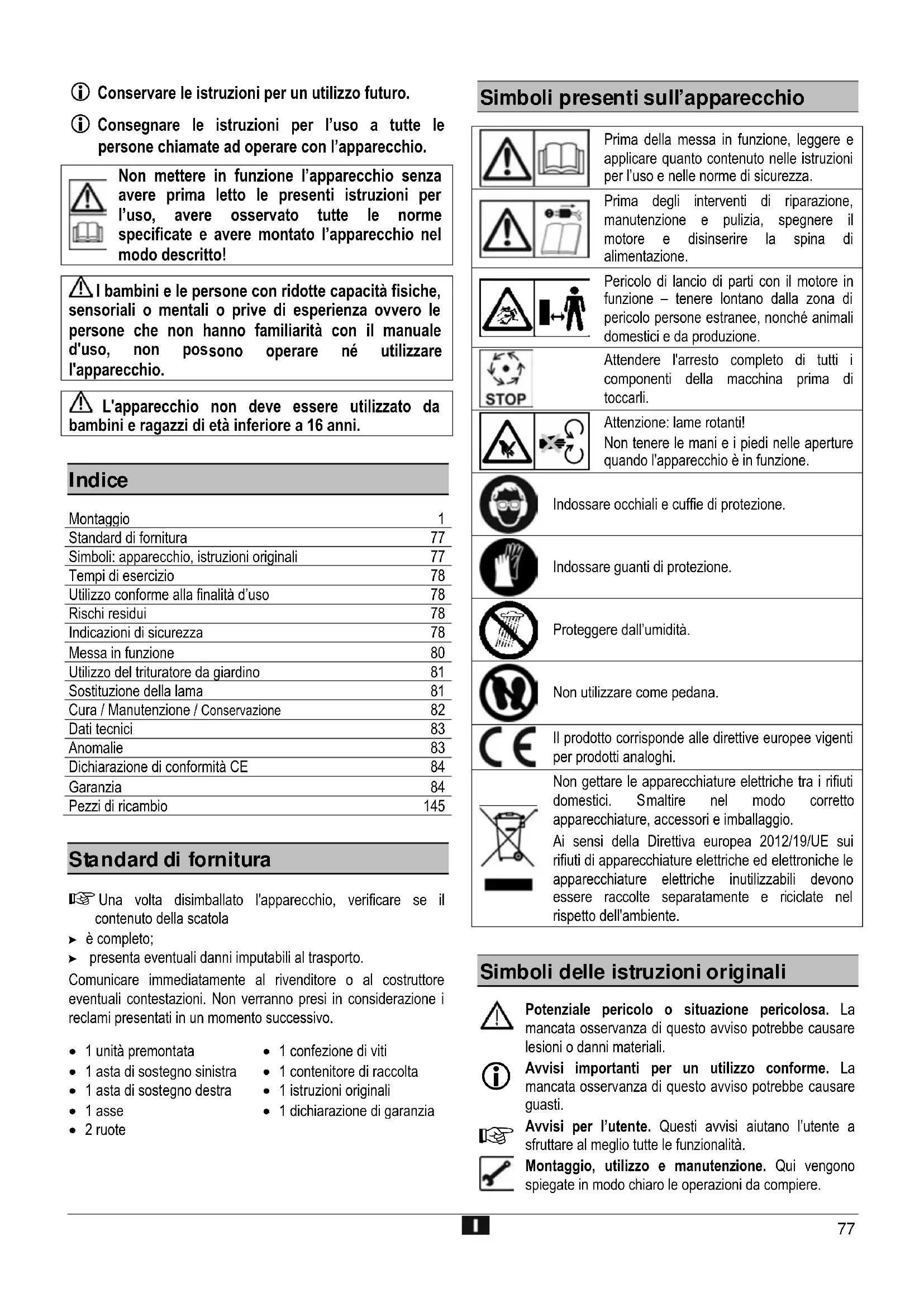 Attendere l'arresto completo di tutti i componenti della macchina prima di toccarli. Attenzione: lame rotanti! Non tenere le mani e i piedi nelle aperture quando l'apparecchio è in funzione. Indossare occhiali e cuffie di protezione. Indossare guanti di protezione. Proteggere dall’umidità. Non utilizzare come pedana. Il prodotto corrisponde alle direttive europee vigenti per prodotti analoghi. Non gettare le apparecchiature elettriche tra i rifiuti domestici. S maltire nel modo corretto apparecchiature, accessori e imballaggio. Ai sensi della Direttiva europea 2012/19/U E sui rifiuti di apparecchiature elettriche ed elettroniche le apparecchiature elettriche inutilizzabili devono essere raccolte separatamente e ri ciclate nel rispetto dell'ambiente.