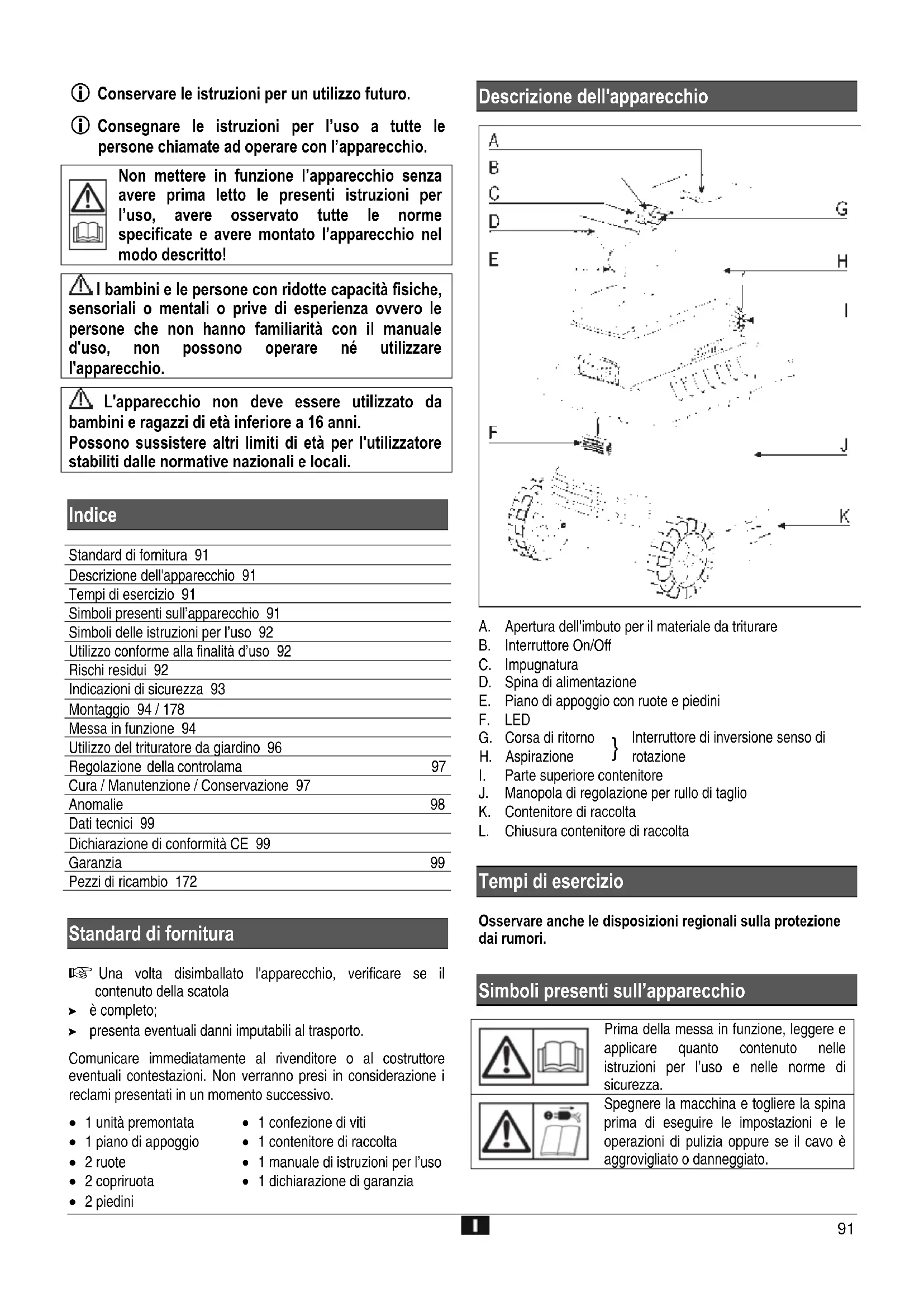 Indice Standard di fornitura 91 Descrizione dell'apparecchio 91 Tempi di esercizio 91 Simboli presenti sull’apparecchio 91 Simboli delle istruzioni per l’uso 92 Utilizzo conforme alla finalità d’uso 92 Rischi residui 92 Indicazioni di sicurezza 93 Montaggio 94 / 178 Messa in funzione 94 Utilizzo del trituratore da giardino 96 Regolazione della controlama 97 Cura / Manutenzione / Conservazione 97 Anomalie 98 Dati tecnici 99 Dichiarazione di conformità CE 99 Garanzia 99 Pezzi di ricambio 172
