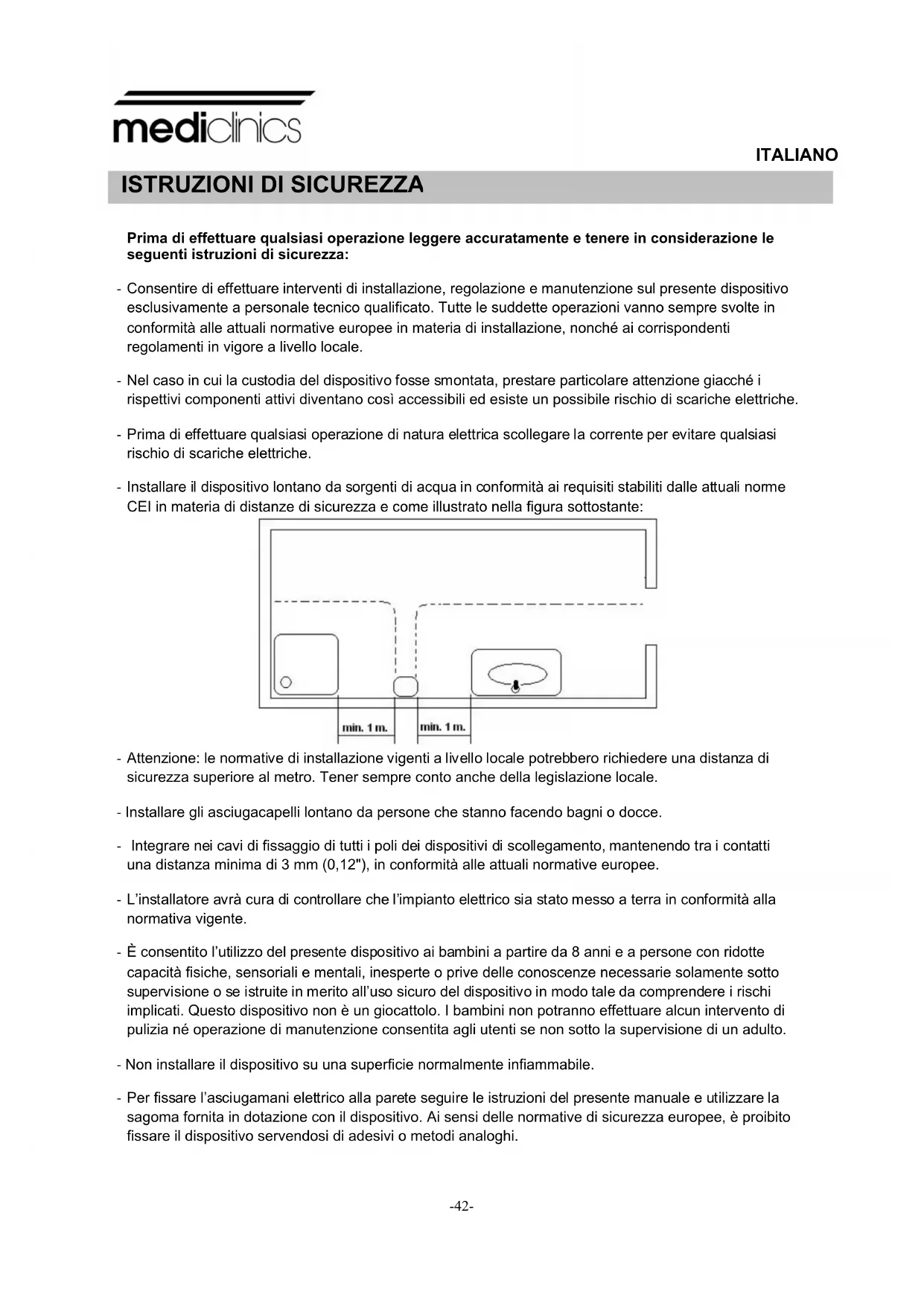 - Attenzione: le normative di installazione vigenti a livello locale potrebbero richiedere una distanza di sicurezza superiore al metro. Tener sempre conto anche della legislazione locale. - Installare gli asciugacapelli lontano da persone che stanno facendo bagni o docce. - Integrare nei cavi di fissaggio di tutti i poli dei dispositivi di scollegamento, mantenendo tra i contatti una distanza minima di 3 mm (0,12"), in conformità alle attuali normative europee. - L’installatore avrà cura di controllare che l’impianto elettrico sia stato messo a terra in conformità alla normativa vigente. - È consentito l’utilizzo del presente dispositivo ai bambini a partire da 8 anni e a persone con ridotte capacità fisiche, sensoriali e mentali, inesperte o prive delle conoscenze necessarie solamente sotto supervisione o se istruite in merito all’uso sicuro del dispositivo in modo tale da comprendere i rischi implicati. Questo dispositivo non è un giocattolo. I bambini non potranno effettuare alcun intervento di pulizia né operazione di manutenzione consentita agli utenti se non sotto la supervisione di un adulto. - Non installare il dispositivo su una superficie normalmente infiammabile. - Per fissare l’asciugamani elettrico alla parete seguire le istruzioni del presente manuale e utilizzare la sagoma fornita in dotazione con il dispositivo. Ai sensi delle normative di sicurezza europee, è proibito fissare il dispositivo servendosi di adesivi o metodi analoghi. ITALIANO