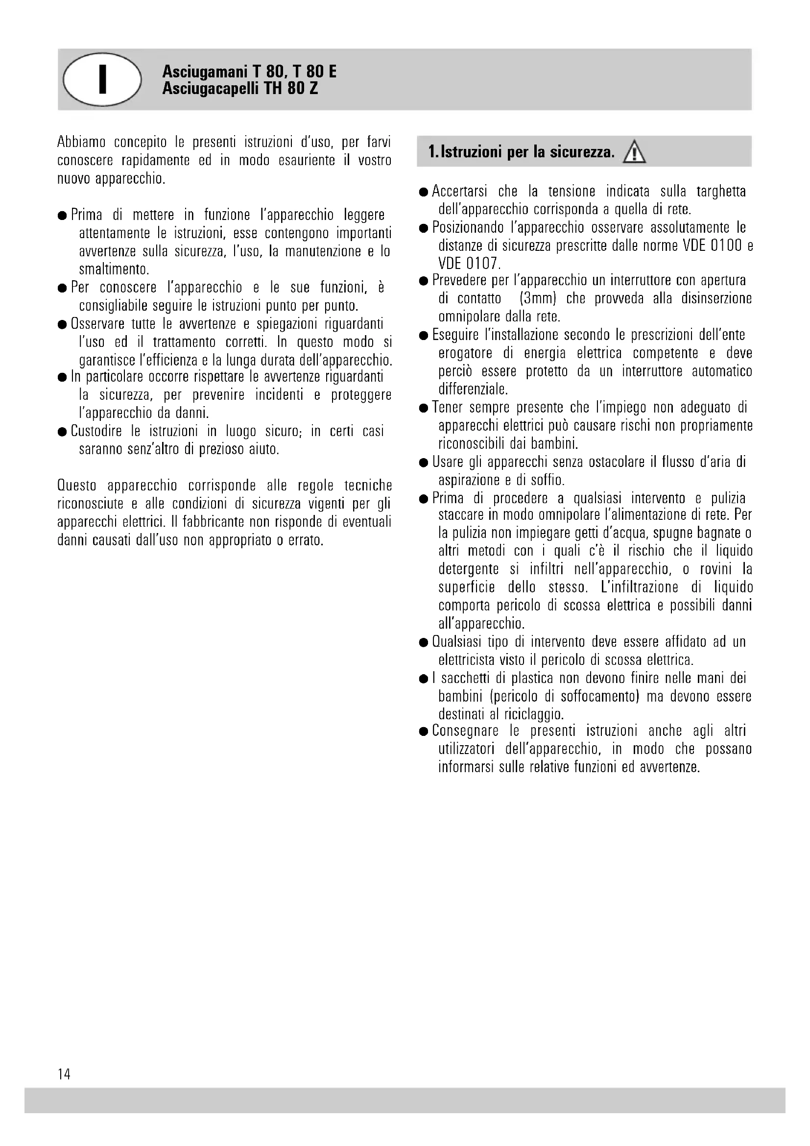 Il montaggio dell'apparecchio deve essere affidato ad uno specialista, per averere la garanzia di un allacciamento eseguito secondo le disposizioni di sicurezza. Per i modelli T 80 e TH 80 Z l'impianto elettrico deve essere dotato di un interrottore automatico o di una protezione. L'installatore deve inoltre provedere ad un dispositivo sezonatore di rete a due poli, con un'apertura di contatto minima di 3 mm per polo.