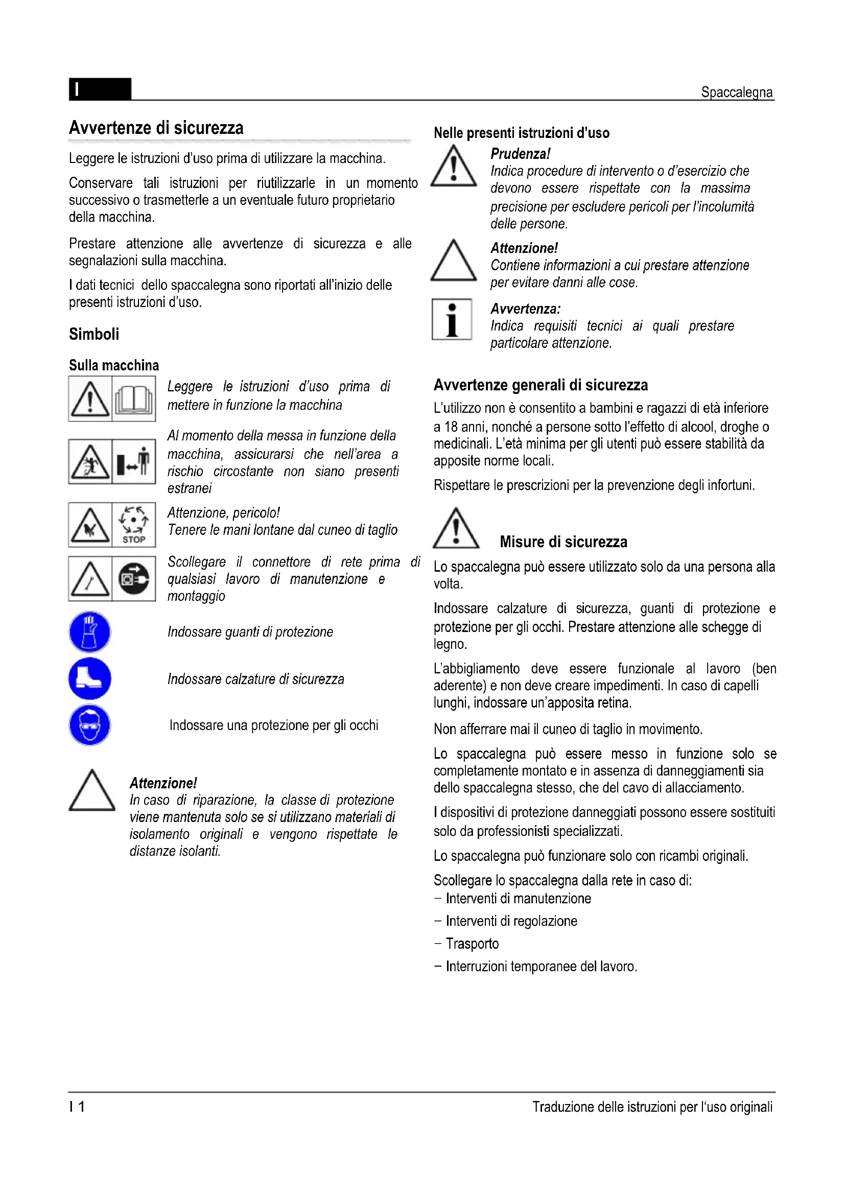 Fal Si aparecen problemas desconecte el motor y desenchufe la máquina de la red. Los fallos que no figuren en la siguiente tabla, deben ser solucionados siempre por personal técnico especializado. Fallo Causa Solución La cuña para presionar la madera no se mueve en ninguna dirección. Nivel de aceite hidráulico muy bajo Rellenar el aceite hidráulico. Defecto en la bomba hidráulica Cambiar la bomba hidráulica El aparato se inclina con declive hacia la cuña de corte Situar el aparato horizontalmente o con inclinación hacia la palanca de manejo La cuña para presionar no tiene fuerza. Nivel de aceite hidráulico muy bajo. Rellenar el aceite hidráulico. El aparato se inclina con declive hacia la cuña de corte Situar el aparato horizontalmente o con inclinación hacia la palanca de manejo El motor no arranca. El interruptor bimetálico lo ha desconectado. Esperar hasta que el motor se enfríe. La bomba hidráulica hace un silbido, la cuña para presionar se mueve bruscamente. Nivel de aceite hidráulico muy bajo. Rellenar el aceite hidráulico. El aparato se inclina con declive hacia la cuña de corte Situar el aparato horizontalmente o con inclinación hacia la palanca de manejo El motor se calienta mucho. Sección transversal del cable demasiado pequeña. Utilizar un cable de mayor sección transversal. El motor no arranca. El interruptor térmico lo ha desconectado. Esperar hasta que el motor se enfríe. Fusible o enchufe defectuosos Avisar a un técnico electricista para su revisión (cable y red eléctrica). Cable defectuoso Cambiar el cable a un técnico electricista para su revisión Defecto en el motor eléctrico Avisar a un técnico electricista para su revisión. Medio ambiente y eliminación No se puede eliminar los aparatos o partes en desuso a través del sistema de recogida de residuos domésticos. El embalaje, la máquina y sus partes complementarias están fabricados de material reciclable pudiendo ser eliminados según sus propiedades. Traducción del manual de instrucciones original E 5I Spaccalegna Avvertenze di sicurezza Leggere le istruzioni d’uso prima di utilizzare la macchina. Conservare tali istruzioni per riutilizzarle in un momento successivo o trasmetterle a un eventuale futuro proprietario della macchina. Prestare attenzione alle avvertenze di sicurezza e alle segnalazioni sulla macchina. I dati tecnici dello spaccalegna sono riportati all’inizio delle presenti istruzioni d’uso. Simboli Sulla macchina Leggere le istruzioni d’uso prima di mettere in funzione la macchina Al momento della messa in funzione della macchina, assicurarsi che nell’area a rischio circostante non siano presenti estranei Attenzione, pericolo! Tenere le mani lontane dal cuneo di taglio Scollegare il connettore di rete prima di qualsiasi lavoro di manutenzione e montaggio Indossare guanti di protezione Indossare calzature di sicurezza Indossare una protezione per gli occhi Attenzione! In caso di riparazione, la classe di protezione viene mantenuta solo se si utilizzano materiali di isolamento originali e vengono rispettate le distanze isolanti. Nelle presenti istruzioni d’uso Prudenza! Indica procedure di intervento o d’esercizio che devono essere rispettate con la massima precisione per escludere pericoli per l’incolumità delle persone. Attenzione! Contiene informazioni a cui prestare attenzione per evitare danni alle cose. Avvertenza: Indica requisiti tecnici ai quali prestare particolare attenzione. Avvertenze generali di sicurezza L’utilizzo non è consentito a bambini e ragazzi di età inferiore a 18 anni, nonché a persone sotto l’effetto di alcool, droghe o medicinali. L’età minima per gli utenti può essere stabilità da apposite norme locali. Rispettare le prescrizioni per la prevenzione degli infortuni. Misure di sicurezza Lo spaccalegna può essere utilizzato solo da una persona alla volta. Indossare calzature di sicurezza, guanti di protezione e protezione per gli occhi. Prestare attenzione alle schegge di legno. L’abbigliamento deve essere funzionale al lavoro (ben aderente) e non deve creare impedimenti. In caso di capelli lunghi, indossare un’apposita retina. Non afferrare mai il cuneo di taglio in movimento. Lo spaccalegna può essere messo in funzione solo se completamente montato e in assenza di danneggiamenti sia dello spaccalegna stesso, che del cavo di allacciamento. I dispositivi di protezione danneggiati possono essere sostituiti solo da professionisti specializzati. Lo spaccalegna può funzionare solo con ricambi originali. Scollegare lo spaccalegna dalla rete in caso di: − Interventi di manutenzione − Interventi di regolazione − Trasporto − Interruzioni temporanee del lavoro. I 1 Traduzione delle istruzioni per l‘uso originaliSpaccalegna I Le riparazioni sullo spaccalegna possono essere effettuate solo da tecnici specializzati. Non lasciare lo spaccalegna incustodito. Non azionare lo spaccalegna se nelle vicinanze si trovano persone non autorizzate. Non utilizzare lo spaccalegna in caso di pioggia, non lasciarlo sotto la pioggia e non pulirlo con acqua: pericolo di scosse elettriche. Nella zona di taglio non devono essere presenti estranei. Prestare attenzione anche a bambini e animali. Chi utilizza lo spaccalegna è responsabile per eventuali infortuni di altre persone o danni alle loro cose. Mantenere la zona di taglio sgombra da pezzetti di legno e altri oggetti – pericolo di inciampare. Dispositivi di sicurezza Salvamotore In caso di sovraccarico del motore, il salvamotore lo spegne. La funzionalità del salvamotore non deve essere disattivata. Se il salvamotore ha disattivato lo spaccalegna, procedere come segue: