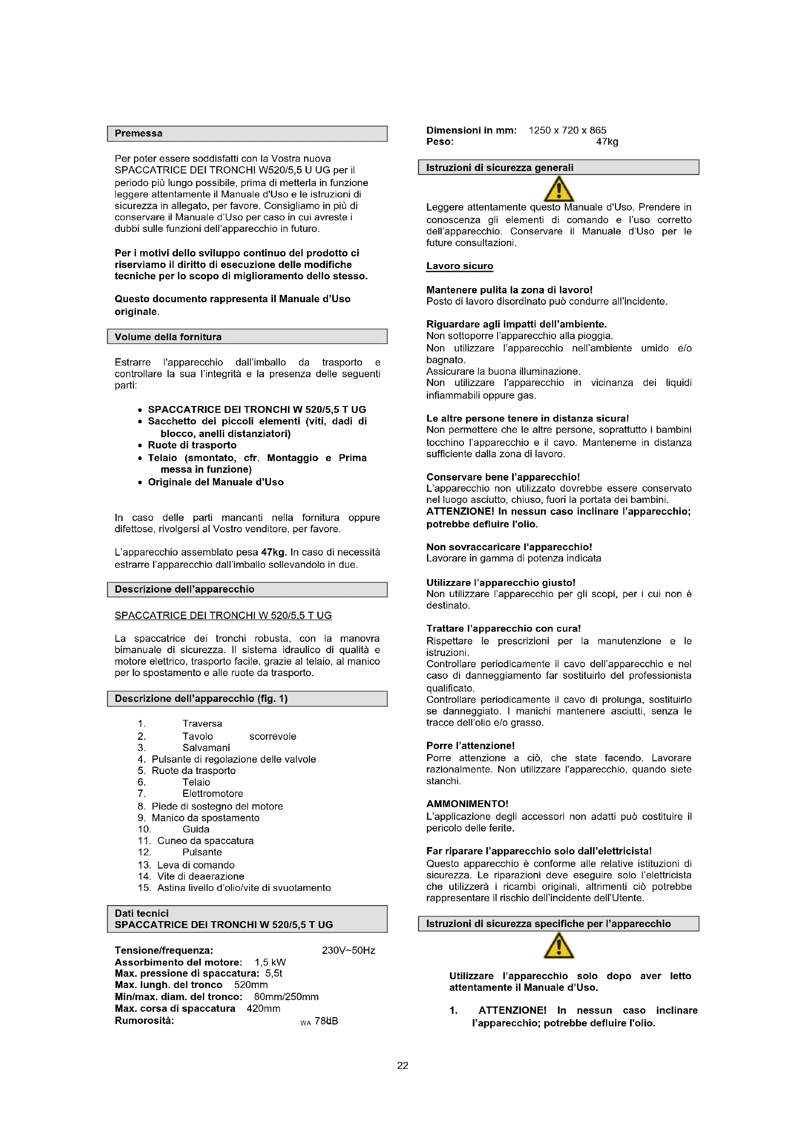 Per poter essere soddisfatti con la Vostra nuova SPACCATRICE DEI TRONCHI W520/5,5 U UG per il periodo più lungo possible, prima di metterla in funzione leggere attentamente il Manuale d'Uso e le istruzioni di sicurezza in allegato, per favore. Consigliamo in più di conservare il Manuale d'Uso per caso in cui avreste i dubbi sulle funzioni dell'apparecchio in futuro.