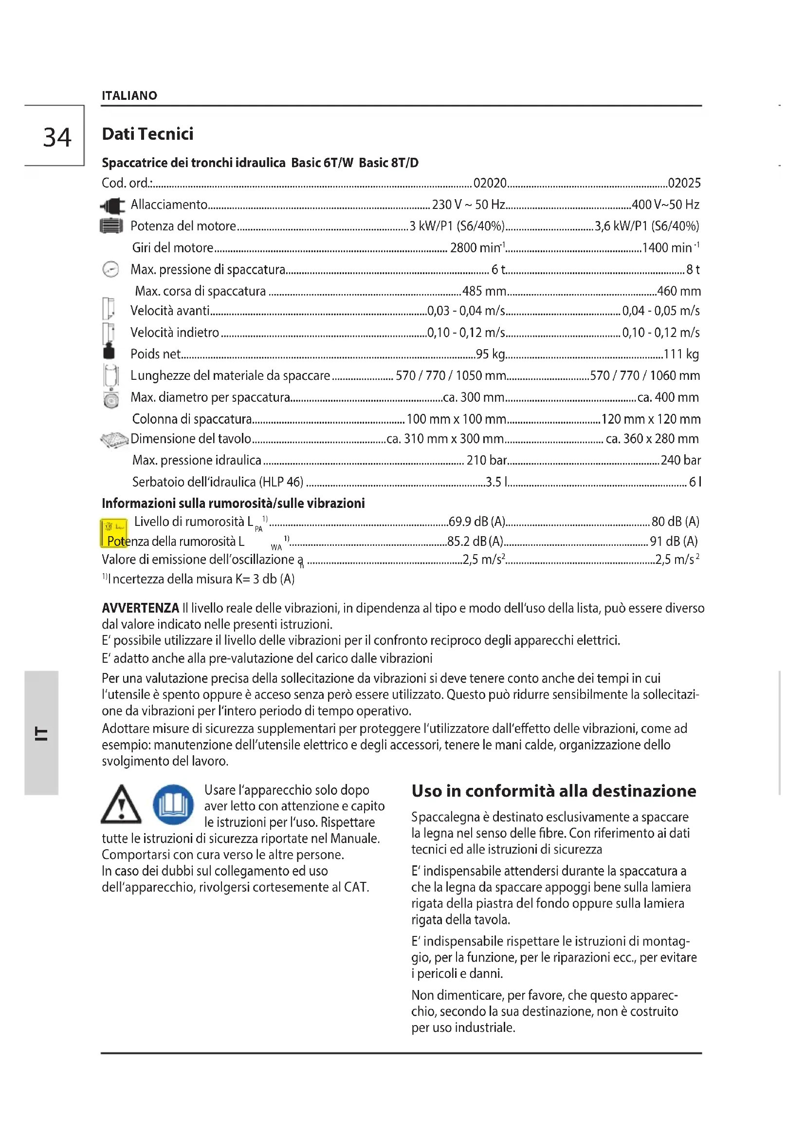 Spaccalegna è destinato esclusivamente a spaccare la legna nel senso delle fibre. Con riferimento ai dati tecnici ed alle istruzioni di sicurezza