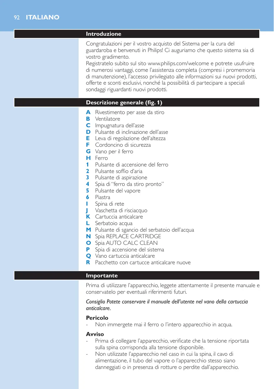 Lisez attentivement ce mode d’emploi avant d’utiliser l’appareil et conservez-le pour un usage ultérieur. Conseil :Vous pouvez loger le mode d’emploi dans le compartiment de rangement des cartouches anticalcaire. Danger -- Ne plongez jamais le fer ni l’appareil dans l’eau. Avertissement -- Avant de brancher l’appareil, vérifiez que la tension indiquée sur l’appareil correspond à la tension supportée par le secteur local. -- N’utilisez pas l’appareil si la fiche, le cordon d’alimentation, le cordon flexible ou l’appareil lui-même sont endommagés, si l’appareil est tombé ou s’il fuit.