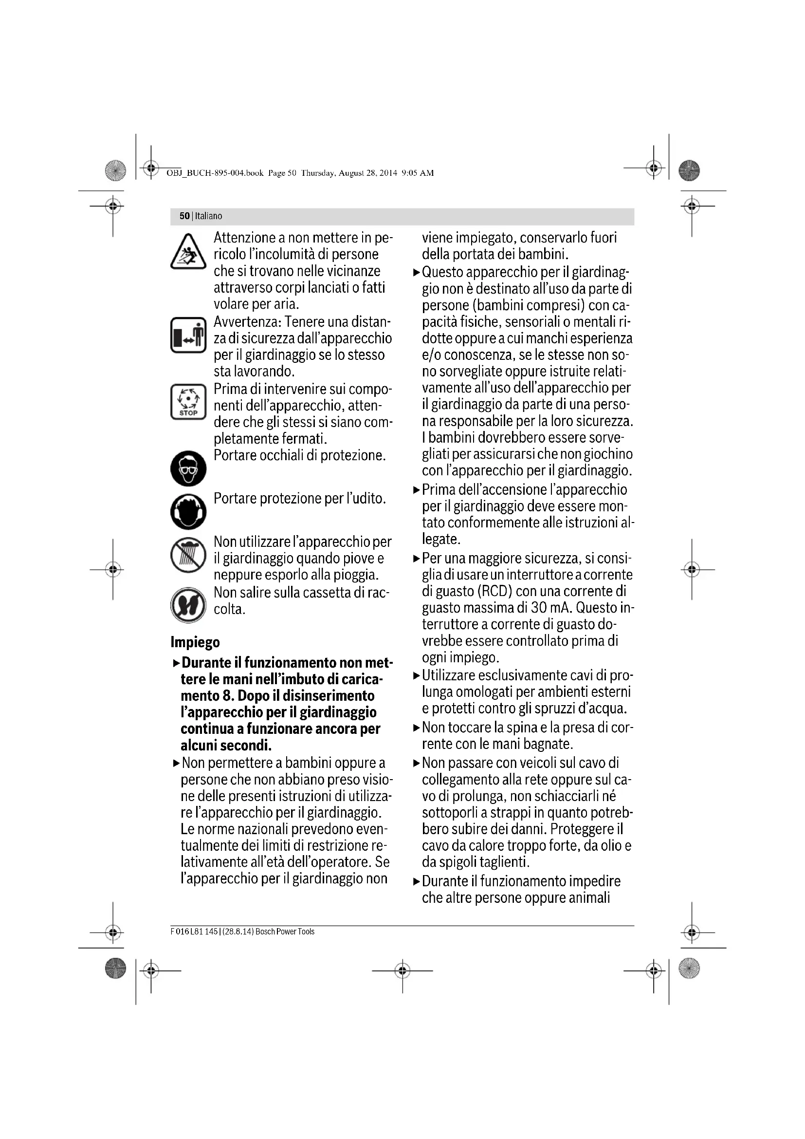 A seconda del tipo del materiale triturato. Le operazioni di accensione producono temporanei abbassamenti di tensione. In caso di reti di alimentazioni che non siano in condizioni ottimali può capitare che altri apparecchi possono subire dei disturbi. In caso di impedenze di rete minori di 0,36 Ohm non ci si aspetta nessuna disfunzione. Henk Becker Executive Vice President Engineering Helmut Heinzelmann Head of Product Certification PT/ETM9 OBJ_BUCH-895-004.book Page 54 Thursday, August 28, 2014 9:05 AMItaliano | 55 Bosch Power Tools F 016 L81 145 | (28.8.14) Un cavo di prolunga con una sezione trasversale troppo picco- la causa una sensibile riduzione delle prestazioni dell’appa- recchio per il giardinaggio. Per i cavi con una lunghezza fino a 25 m è necessaria una sezione trasversale di almeno 3x1,5mm