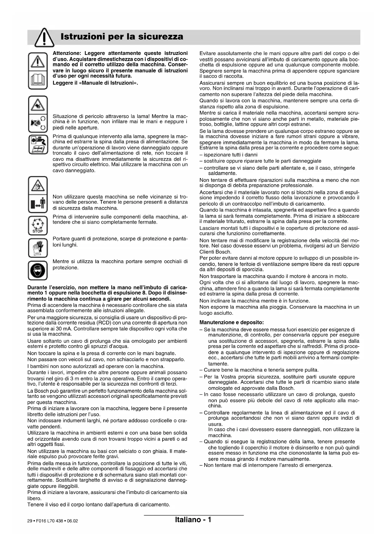 Reservado o direito a modificações Serviço ao cliente Declaração de conformidade F016 L70 438 - book.book Seite 5 Dienstag, 28. Februar 2006 3:26 15 28 • F016 L70 438 • 06.02Italiano - 1 Attenzione: Leggere attentamente queste istruzioni d’uso. Acquistare dimestichezza con i dispositivi di co- mando ed il corretto utilizzo della macchina. Conser- vare in luogo sicuro il presente manuale di istruzioni d’uso per ogni necessità futura. Leggere il «Manuale di Istruzioni». Situazione di pericolo attraverso la lama! Mentre la mac- china è in funzione, non infilare mai le mani e neppure i piedi nelle aperture. Prima di qualunque intervento alla lama, spegnere la mac- china ed estrarre la spina dalla presa di alimentazione. Se durante un’operazione di lavoro viene danneggiato oppure troncato il cavo dell’alimentazione di rete, non toccare il cavo ma disattivare immediatamente la sicurezza del ri- spettivo circuito elettrico. Mai utilizzare la macchina con un cavo danneggiato. Non utilizzare questa macchina se nelle vicinanze si tro- vano delle persone. Tenere le persone presenti a distanza di sicurezza dalla macchina. Prima di intervenire sulle componenti della macchina, at- tendere che si siano completamente fermate. Portare guanti di protezione, scarpe di protezione e panta- loni lunghi. Mentre si utilizza la macchina portare sempre occhiali di protezione. Durante l’esercizio, non mettere la mano nell’imbuto di carica- mento 1 oppure nella bocchetta di espulsione 8. Dopo il disinse- rimento la macchina continua a girare per alcuni secondi. Prima di accendere la macchina è necessario controllare che sia stata assemblata conformemente alle istruzioni allegate. Per una maggiore sicurezza, si consiglia di usare un dispositivo di pro- tezione dalla corrente residua (RCD) con una corrente di apertura non superiore ai 30 mA. Controllare sempre tale dispositivo ogni volta che si usa la macchina. Usare soltanto un cavo di prolunga che sia omologato per ambienti esterni e protetto contro gli spruzzi d’acqua. Non toccare la spina e la presa di corrente con le mani bagnate. Non passare con veicoli sul cavo, non schiacciarlo e non strapparlo. I bambini non sono autorizzati ad operare con la macchina. Durante i lavori, impedire che altre persone oppure animali possano trovarsi nel giro di 3 m entro la zona operativa. Entro il campo opera- tivo, l’utente è responsabile per la sicurezza nei confronti di terzi. La Bosch può garantire un perfetto funzionamento della macchina sol- tanto se vengono utilizzati accessori originali specificatamente previsti per questa macchina. Prima di iniziare a lavorare con la macchina, leggere bene il presente libretto delle istruzioni per l’uso. Non indossare indumenti larghi, né portare addosso cordicelle o cra- vatte pendenti. Utilizzare la macchina in ambienti esterni e con una base ben solida ed orizzontale avendo cura di non trovarsi troppo vicini a pareti o ad altri oggetti fissi. Non utilizzare la macchina su basi con selciato o con ghiaia. Il mate- riale espulso può provocare ferite gravi. Prima della messa in funzione, controllare la posizione di tutte le viti, delle madreviti e delle altre componenti di fissaggio ed accertarsi che tutti i dispositivi di protezione e di schermatura siano stati montati cor- rettamente. Sostituire targhette di avviso e di segnalazione danneg- giate oppure illeggibili. Prima di iniziare a lavorare, assicurarsi che l’imbuto di caricamento sia libero. Tenere il viso ed il corpo lontano dall’apertura di caricamento. Evitare assolutamente che le mani oppure altre parti del corpo o dei vestiti possano avvicinarsi all’imbuto di caricamento oppure alla boc- chetta di espulsione oppure ad una qualunque componente mobile. Spegnere sempre la macchina prima di appendere oppure sganciare il sacco di raccolta. Assicurarsi sempre un buon equilibrio ed una buona posizione di la- voro. Non inclinarsi mai troppo in avanti. Durante l’operazione di cari- camento non superare l’altezza del piede della macchina. Quando si lavora con la macchina, mantenere sempre una certa di- stanza rispetto alla zona di espulsione. Mentre si carica il materiale nella macchina, accertarsi sempre scru- polosamente che non vi siano anche parti in metallo, materiale pie- troso, bottiglie, lattine oppure altri corpi estranei. Se la lama dovesse prendere un qualunque corpo estraneo oppure se la macchina dovesse iniziare a fare rumori strani oppure a vibrare, spegnere immediatamente la macchina in modo da fermare la lama. Estrarre la spina dalla presa per la corrente e procedere come segue: – ispezionare tutti i danni – sostituire oppure riparare tutte le parti danneggiate – controllare se vi siano delle parti allentate e, se il caso, stringerle saldamente. Non tentare di effettuare riparazioni sulla macchina a meno che non si disponga di debita preparazione professionale. Accertarsi che il materiale lavorato non si blocchi nella zona di espul- sione impedendo il corretto flusso della lavorazione e provocando il pericolo di un contraccolpo nell’imbuto di caricamento. Quando la macchina è intasata, spegnerla ed aspettare fino a quando la lama si sarà fermata completamente. Prima di iniziare a sbloccare il materiale triturato, estrarre la spina dalla presa per la corrente. Lasciare montati tutti i dispositivi e le coperture di protezione ed assi- curarsi che funzionino correttamente. Non tentare mai di modificare la registrazione della velocità del mo- tore. Nel caso dovesse esservi un problema, rivolgersi ad un Servizio Clienti Bosch. Per poter evitare danni al motore oppure lo sviluppo di un possibile in- cendio, tenere le feritoie di ventilazione sempre libere da resti oppure da altri depositi di sporcizia. Non trasportare la macchina quando il motore è ancora in moto. Ogni volta che ci si allontana dal luogo di lavoro, spegnere la mac- china, attendere fino a quando la lama si sarà fermata completamente ed estrarre la spi