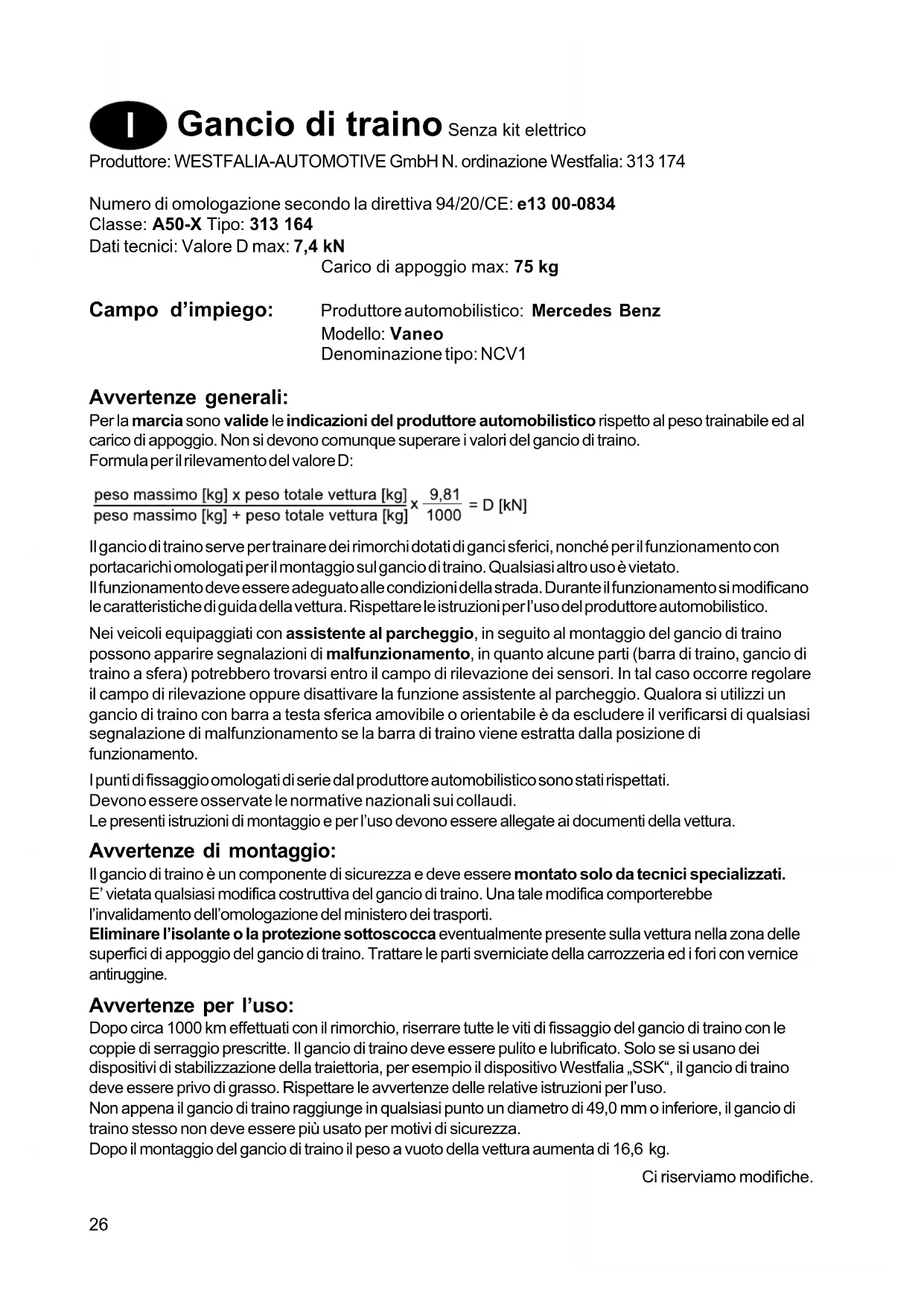 ¦¾½Œ€¯º±½Œ¾ ¹ª ¹®¿¦º± ª€½²ñª¾÷®ÿ ¦½¹Œ³ õ¼¢õª¯ º¦ ¦õŒ¹¦€¼³ºª½¦¯ ® ¼¡©åŒÿ ¹ª ÷ø¦¯¼¯€± €ªø¦ð± -ª³ñ®ÿ €¦¯ ½Œ õµ¹¦ ø¼¦ã±ÿ º¦ ª¥º¦¯ ½ŒõŒæª½®¹¢ºŒ ÷½® æ¢÷® ½Œ¾. (H ¼¡©åŒÿ ¹ª ÷ø¦¯¼¯€± €ªø¦ð± -ª³ñ®ÿ 媺 ªõ¯½¼¢õª½¦¯ º¦ ¢¼æª¯ ÷ª ªõ¦ø± ¹ª ½Œº ¦½¹²)26 Gancio di traino Senza kit elettrico Produttore: WESTFALIA-AUTOMOTIVE GmbH N. ordinazione Westfalia: 313 174 Numero di omologazione secondo la direttiva 94/20/CE: e13 00-0834 Classe: A50-X Tipo: 313 164 Dati tecnici: Valore D max: 7,4 kN Carico di appoggio max: 75 kg Campo d’impiego: Produttore automobilistico: Mercedes Benz Modello: Vaneo Denominazione tipo: NCV1 Avvertenze generali: Per la marcia sono valide le indicazioni del produttore automobilistico rispetto al peso trainabile ed al carico di appoggio. Non si devono comunque superare i valori del gancio di traino. Formula per il rilevamento del valore D: Il gancio di traino serve per trainare dei rimorchi dotati di ganci sferici, nonché per il funzionamento con portacarichi omologati per il montaggio sul gancio di traino. Qualsiasi altro uso è vietato. Il funzionamento deve essere adeguato alle condizioni della strada. Durante il funzionamento si modificano le caratteristiche di guida della vettura. Rispettare le istruzioni per l’uso del produttore automobilistico. Nei veicoli equipaggiati con assistente al parcheggio, in seguito al montaggio del gancio di traino possono apparire segnalazioni di malfunzionamento, in quanto alcune parti (barra di traino, gancio di traino a sfera) potrebbero trovarsi entro il campo di rilevazione dei sensori. In tal caso occorre regolare il campo di rilevazione oppure disattivare la funzione assistente al parcheggio. Qualora si utilizzi un gancio di traino con barra a testa sferica amovibile o orientabile è da escludere il verificarsi di qualsiasi segnalazione di malfunzionamento se la barra di traino viene estratta dalla posizione di funzionamento. I punti di fissaggio omologati di serie dal produttore automobilistico sono stati rispettati. Devono essere osservate le normative nazionali sui collaudi. Le presenti istruzioni di montaggio e per l’uso devono essere allegate ai documenti della vettura. Avvertenze di montaggio: Il gancio di traino è un componente di sicurezza e deve essere montato solo da tecnici specializzati. E’ vietata qualsiasi modifica costruttiva del gancio di traino. Una tale modifica comporterebbe l’invalidamento dell’omologazione del ministero dei trasporti. Eliminare l’isolante o la protezione sottoscocca eventualmente presente sulla vettura nella zona delle superfici di appoggio del gancio di traino. Trattare le parti sverniciate della carrozzeria ed i fori con vernice antiruggine. Avvertenze per l’uso: Dopo circa 1000 km effettuati con il rimorchio, riserrare tutte le viti di fissaggio del gancio di traino con le coppie di serraggio prescritte. Il gancio di traino deve essere pulito e lubrificato. Solo se si usano dei dispositivi di stabilizzazione della traiettoria, per esempio il dispositivo Westfalia „SSK“, il gancio di traino deve essere privo di grasso. Rispettare le avvertenze delle relative istruzioni per l’uso. Non appena il gancio di traino raggiunge in qualsiasi punto un diametro di 49,0 mm o inferiore, il gancio di traino stesso non deve essere più usato per motivi di sicurezza. Dopo il montaggio del gancio di traino il peso a vuoto della vettura aumenta di 16,6 kg. Ci riserviamo modifiche. I27
