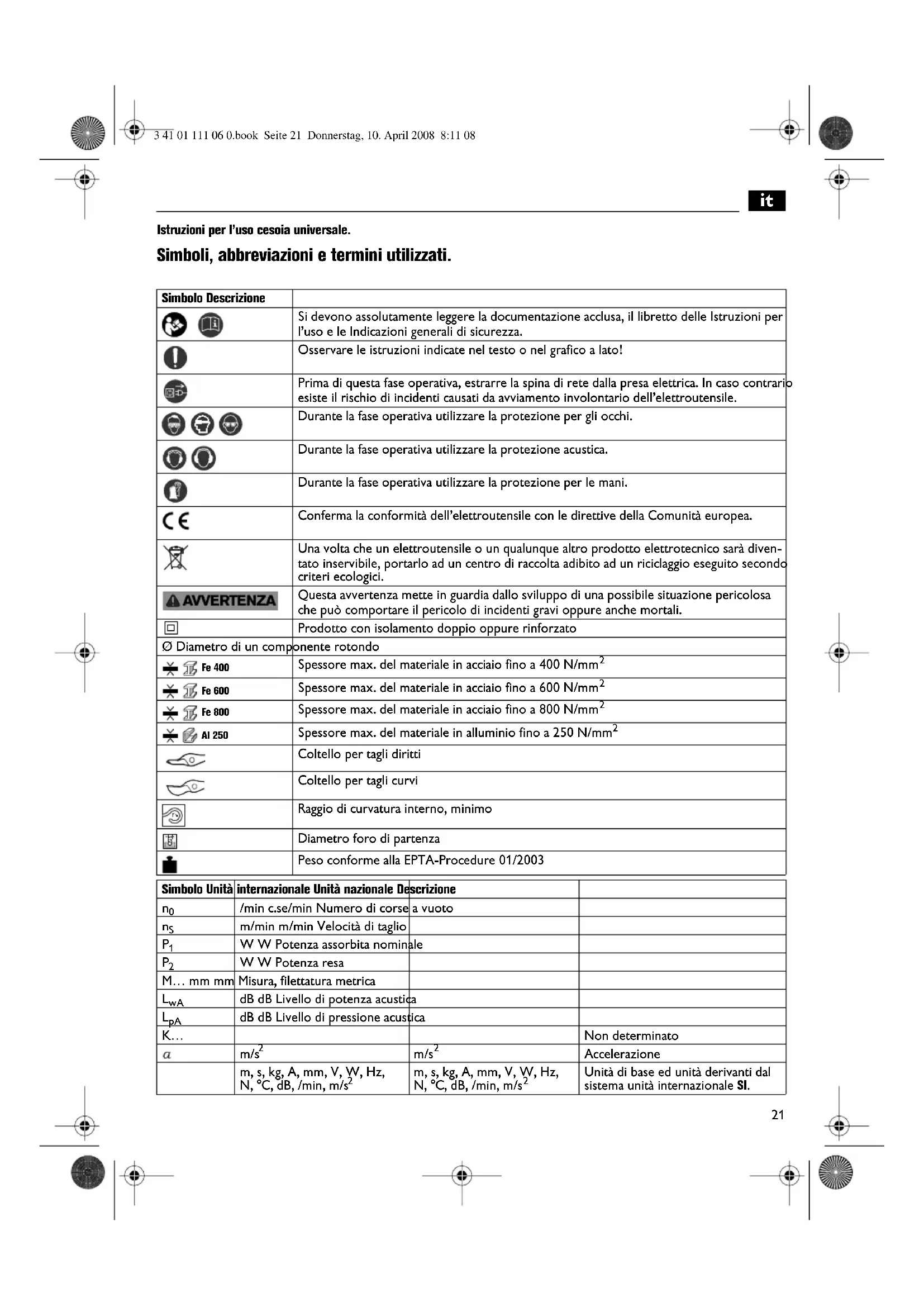 Istruzioni per l’uso cesoia universale. Simboli, abbreviazioni e termini utilizzati. Simbolo Descrizione Si devono assolutamente leggere la documentazione acclusa, il libretto delle Istruzioni per l’uso e le Indicazioni generali di sicurezza. Osservare le istruzioni indicate nel testo o nel grafico a lato! Prima di questa fase operativa, estrarre la spina di rete dalla presa elettrica. In caso contrario esiste il rischio di incidenti causati da avviamento involontario dell’elettroutensile. Durante la fase operativa utilizzare la protezione per gli occhi. Durante la fase operativa utilizzare la protezione acustica. Durante la fase operativa utilizzare la protezione per le mani. Conferma la conformità dell’elettroutensile con le direttive della Comunità europea. Una volta che un elettroutensile o un qualunque altro prodotto elettrotecnico sarà diven- tato inservibile, portarlo ad un centro di raccolta adibito ad un riciclaggio eseguito secondo criteri ecologici. Questa avvertenza mette in guardia dallo sviluppo di una possibile situazione pericolosa che può comportare il pericolo di incidenti gravi oppure anche mortali. Prodotto con isolamento doppio oppure rinforzato Ø Diametro di un componente rotondo Spessore max. del materiale in acciaio fino a 400 N/mm
