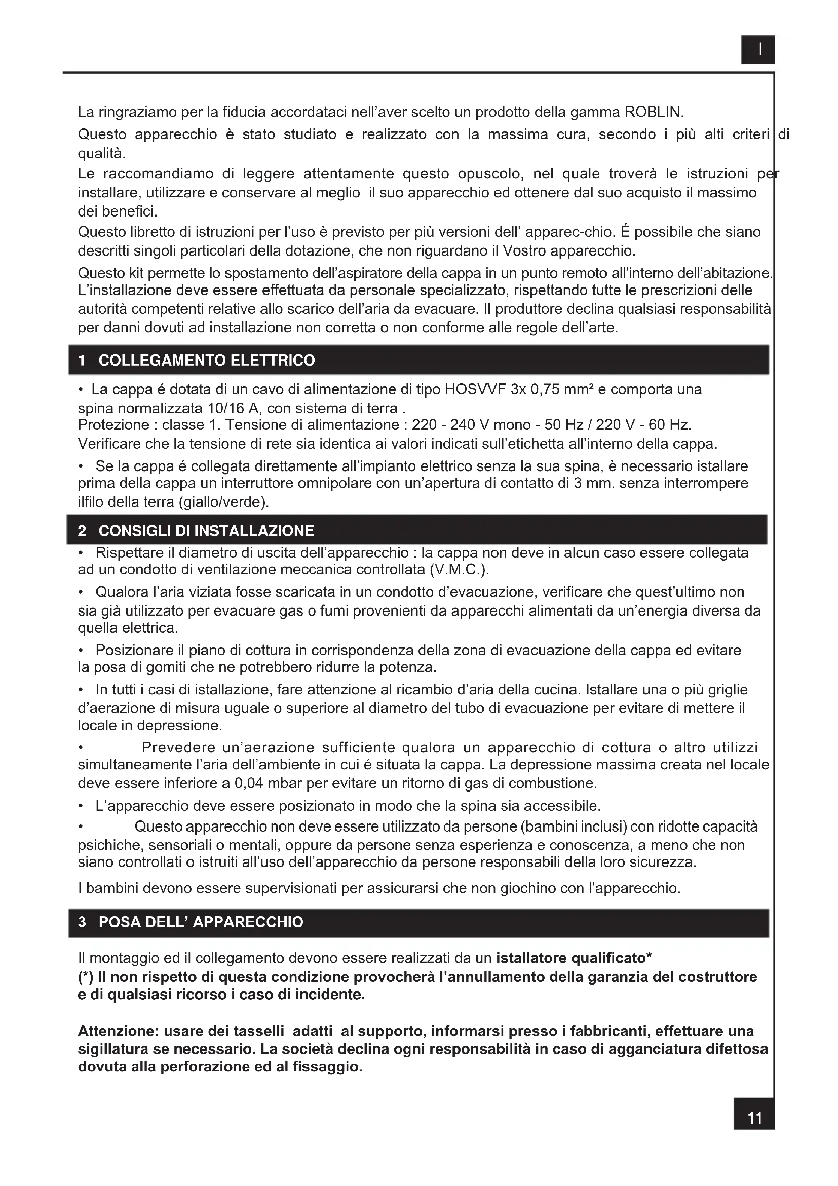 - In tutti i casi di istallazione, fare attenzione al ricambio d’aria della cucina. Istallare una o più griglie d’aerazione di misura uguale o superiore al diametro del tubo di evacuazione per evitare di mettere il locale in depressione.