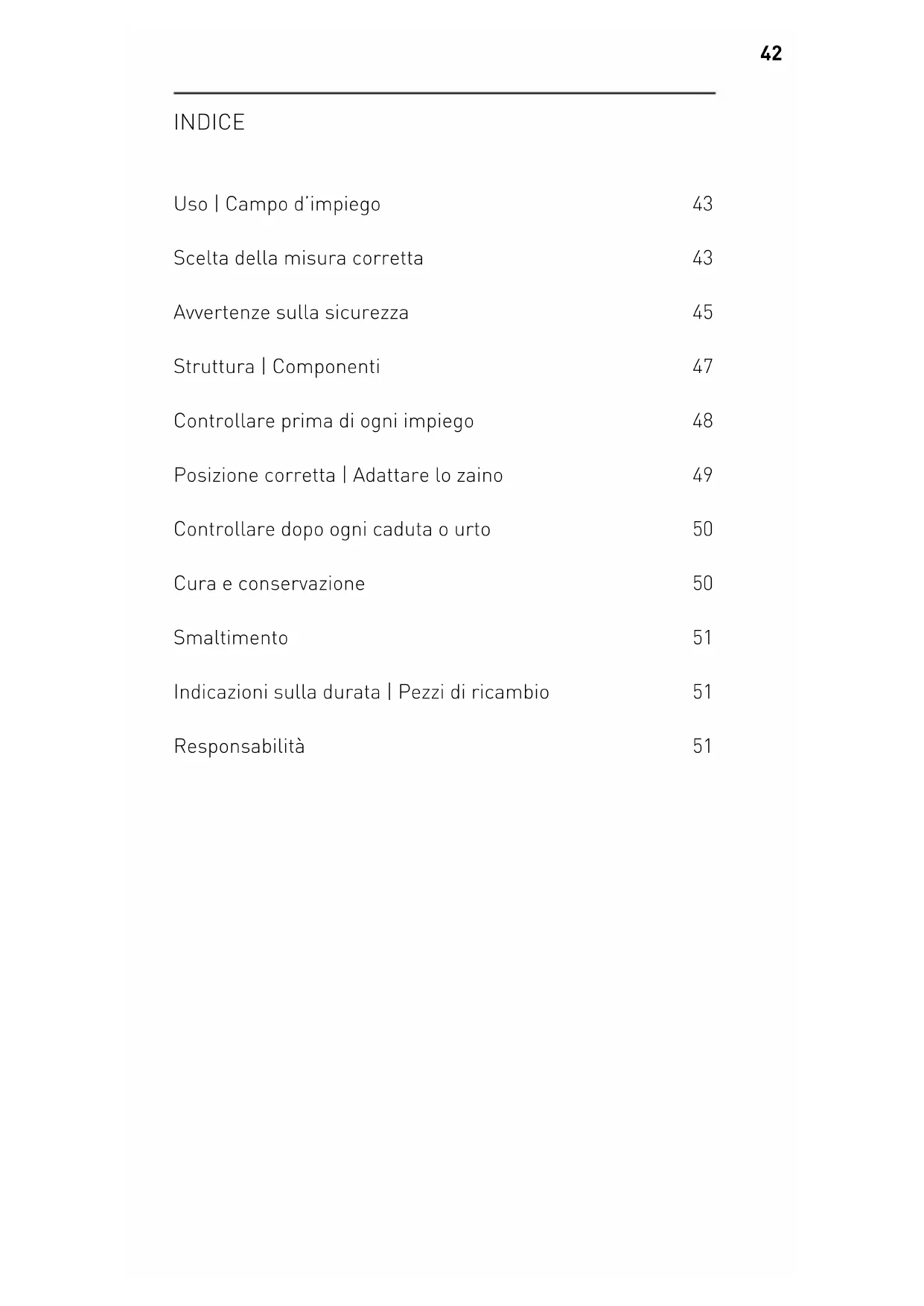 INDICE Uso | Campo d’impiego Scelta della misura corretta Avvertenze sulla sicurezza Struttura | Componenti Controllare prima di ogni impiego Posizione corretta | Adattare lo zaino Controllare dopo ogni caduta o urto Cura e conservazione Smaltimento Indicazioni sulla durata | Pezzi di ricambio Responsabilità43
