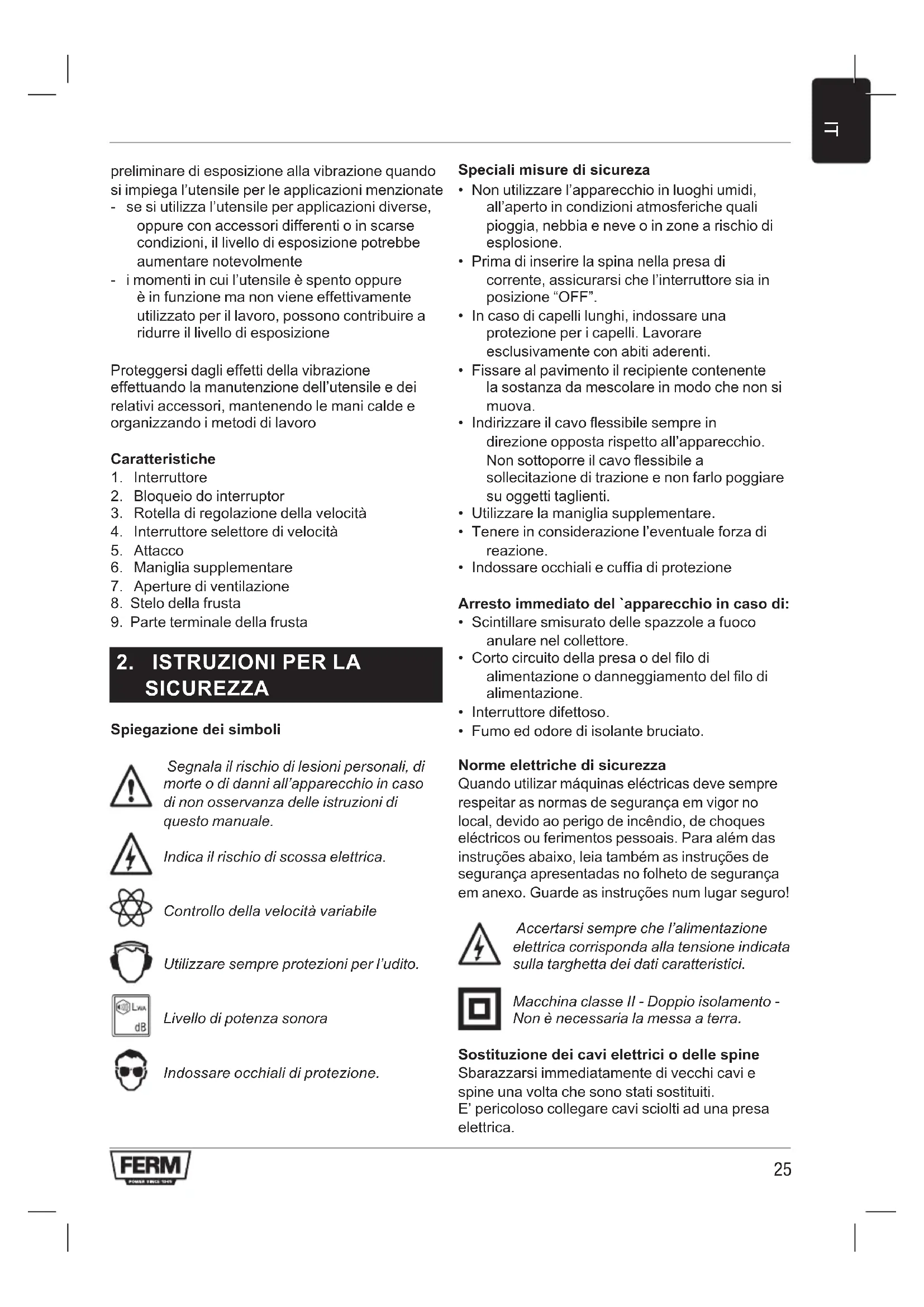 - Fumo ed odore di isolante bruciato. Norme elettriche di sicurezza Quando utilizar máquinas eléctricas deve sempre respeitar as normas de segurança em vigor no local, devido ao perigo de incêndio, de choques eléctricos ou ferimentos pessoais. Para além das instruções abaixo, leia também as instruções de segurança apresentadas no folheto de segurança em anexo. Guarde as instruções num lugar seguro! Accertarsi sempre che l’alimentazione elettrica corrisponda alla tensione indicata sulla targhetta dei dati caratteristici. Macchina classe II - Doppio isolamento - Non è necessaria la messa a terra. Sostituzione dei cavi elettrici o delle spine Sbarazzarsi immediatamente di vecchi cavi e spine una volta che sono stati sostituiti. E’ pericoloso collegare cavi sciolti ad una presa elettrica.26