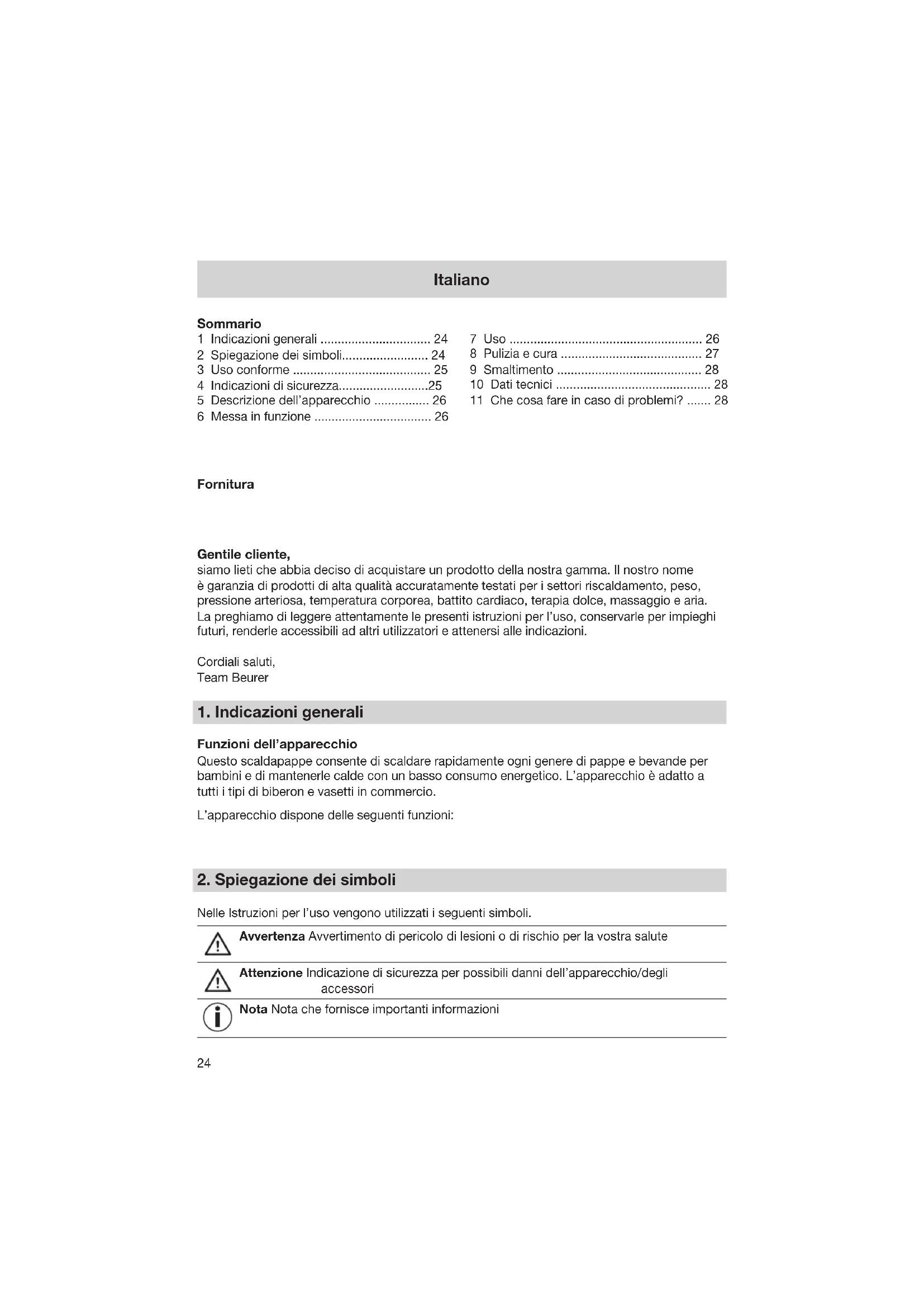 - Nelle Istruzioni per l’uso vengono utilizzati i seguenti simboli. Avvertenza Avvertimento di pericolo di lesioni o di rischio per la vostra salute Attenzione Indicazione di sicurezza per possibili danni dell’apparecchio/degli accessori Nota Nota che fornisce importanti informazioni Italiano Sommario 1 Indicazioni generali p. 24