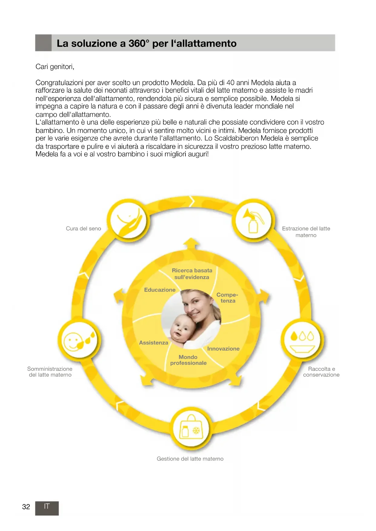 Lasoluzionea360°perl‘allattamento Cari genitori, Congratulazioni per aver scelto un prodotto Medela. Da più di 40 anni Medela aiuta a rafforzare la salute dei neonati attraverso i benefici vitali del latte materno e assiste le madri nell‘esperienza dell‘allattamento, rendendola più sicura e semplice possibile. Medela si impegna a capire la natura e con il passare degli anni è divenuta leader mondiale nel campo dell‘allattamento. L‘allattamento è una delle esperienze più belle e naturali che possiate condividere con il vostro bambino. Un momento unico, in cui vi sentire molto vicini e intimi. Medela fornisce prodotti per le varie esigenze che avrete durante l‘allattamento. Lo Scaldabiberon Medela è semplice da trasportare e pulire e vi aiuterà a riscaldare in sicurezza il vostro prezioso latte materno. Medela fa a voi e al vostro bambino i suoi migliori auguri! Estrazione del latte materno Raccolta e conservazione Gestione del latte materno Somministrazione del latte materno Cura del seno Innovazione Ricerca basata sull’evidenza Mondo professionale Assistenza Compe- tenza Educazione33IT Panoramicadelprodotto On/Off Select Enter