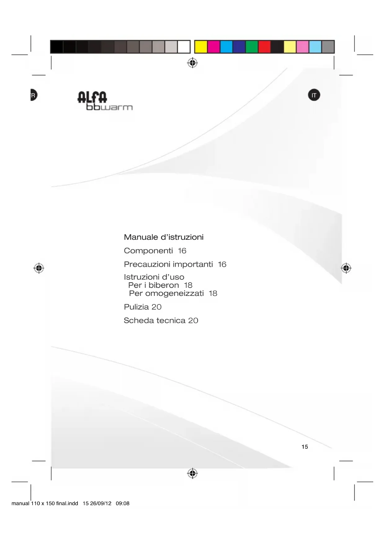 Manuale d’istruzioni Componenti 16 Precauzioni importanti 16 Istruzioni d’uso Per i biberon 18 Per omogeneizzati 18 Pulizia 20 Scheda tecnica 20