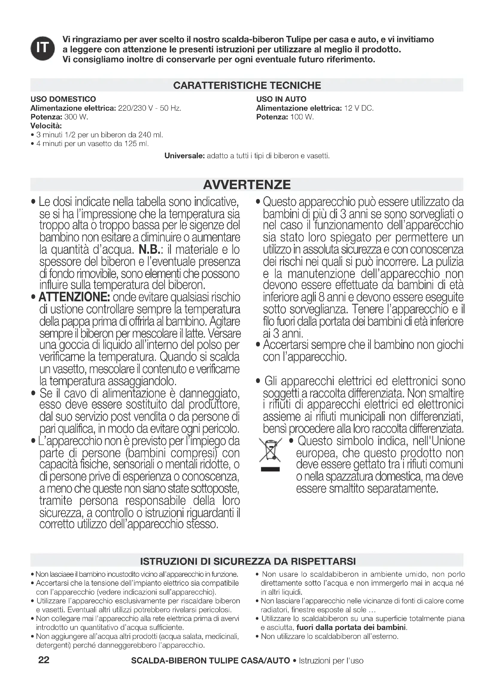 - Questo simbolo indica, nell'Unione europea, che questo prodotto non deve essere gettato tra i rifiuti comuni o nella spazzatura domestica, ma deve essere smaltito separatamente. USO DOMESTICOAlimentazione elettrica: 220/230 V - 50 Hz.Potenza: 300 W.Velocità:• 3 minuti 1/2 per un biberon da 240 ml.• 4 minuti per un vasetto da 125 ml.USO IN AUTOAlimentazione elettrica: 12 V DC.Potenza: 100 W.Universale: adatto a tutti i tipi di biberon e vasetti. CARATTERISTICHE TECNICHE• Utilizzare sempre i cestelli per riscaldare biberon e vasetti, onde evitare di danneggiare l’apparecchio.