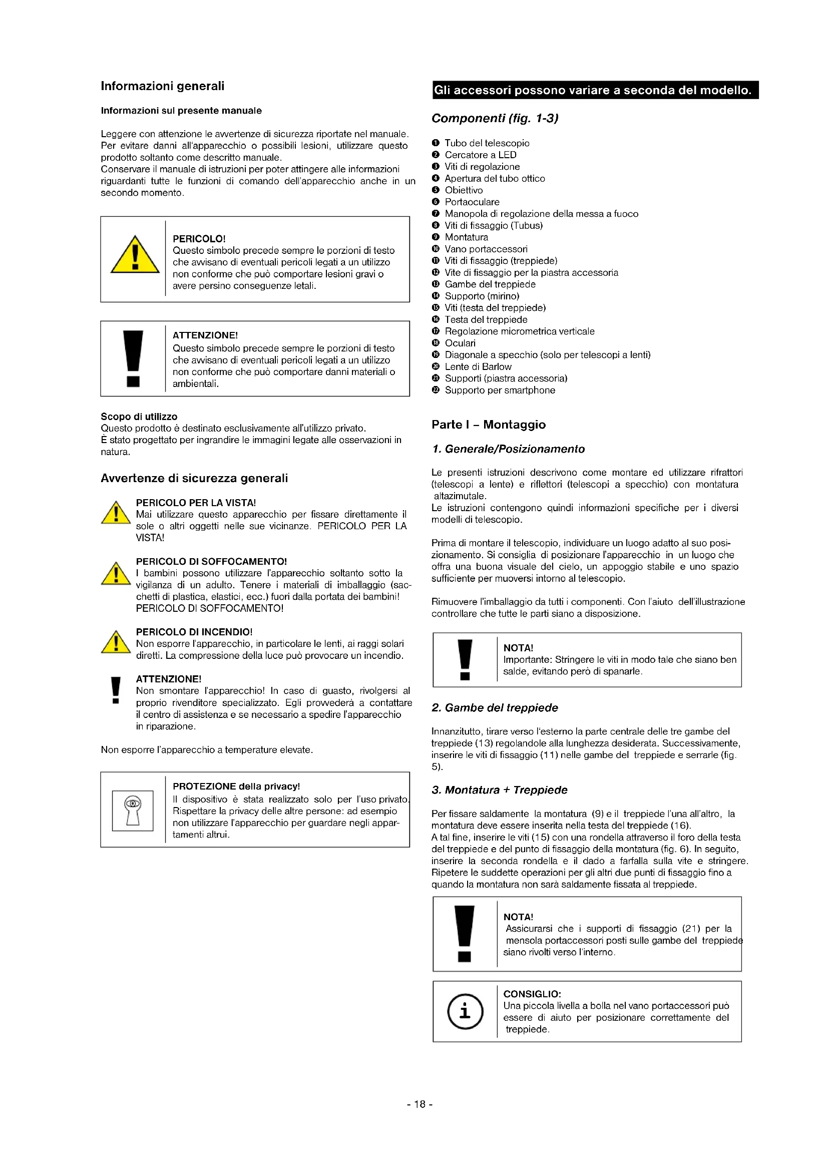 Le presenti istruzioni descrivono come montare ed utilizzare rifrattori (telescopi a lente) e riflettori (telescopi a specchio) con montatura altazimutale. Le istruzioni contengono quindi informazioni specifiche per i diversi modelli di telescopio. Prima di montare il telescopio, individuare un luogo adatto al suo posi- zionamento. Si consiglia di posizionare l’apparecchio in un luogo che offra una buona visuale del cielo, un appoggio stabile e uno spazio sufficiente per muoversi intorno al telescopio. Rimuovere l’imballaggio da tutti i componenti. Con l’aiuto dell’illustrazione controllare che tutte le parti siano a disposizione. NOTA! Importante: Stringere le viti in modo tale che siano ben salde, evitando però di spanarle.