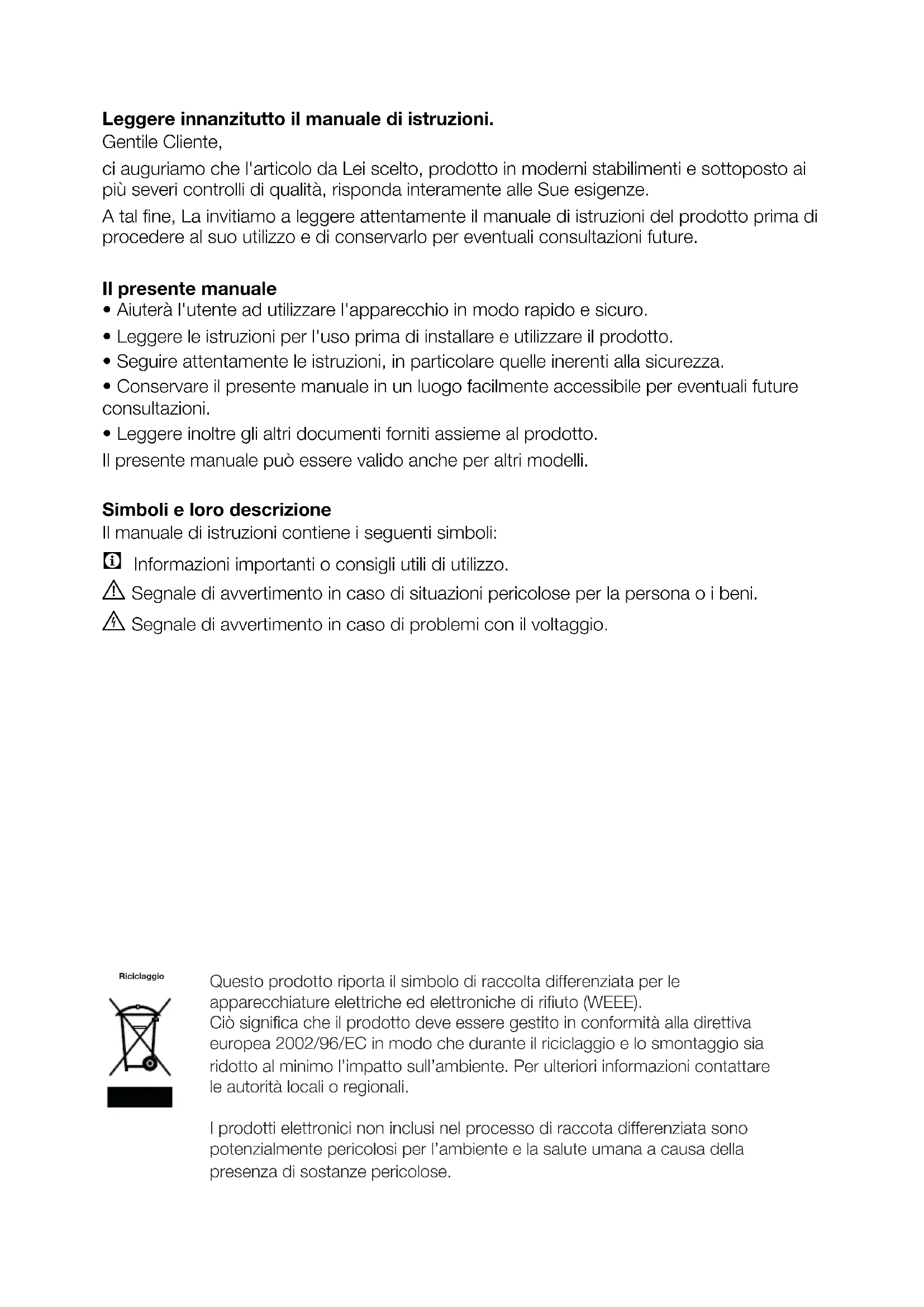 - Leggere inoltre gli altri documenti forniti assieme al prodotto. Il presente manuale può essere valido anche per altri modelli. Simboli e loro descrizione Il manuale di istruzioni contiene i seguenti simboli: C Informazioni importanti o consigli utili di utilizzo. A Segnale di avvertimento in caso di situazioni pericolose per la persona o i beni. B Segnale di avvertimento in caso di problemi con il voltaggio. Questo prodotto riporta il simbolo di raccolta differenziata per le apparecchiature elettriche ed elettroniche di rifiuto (WEEE). Ciò significa che il prodotto deve essere gestito in conformità alla direttiva europea 2002/96/EC in modo che durante il riciclaggio e lo smontaggio sia ridotto al minimo l’impatto sull’ambiente. Per ulteriori informazioni contattare le autorità locali o regionali. I prodotti elettronici non inclusi nel processo di raccota differenziata sono potenzialmente pericolosi per l’ambiente e la salute umana a causa della presenza di sostanze pericolose. RiciclaggioIT