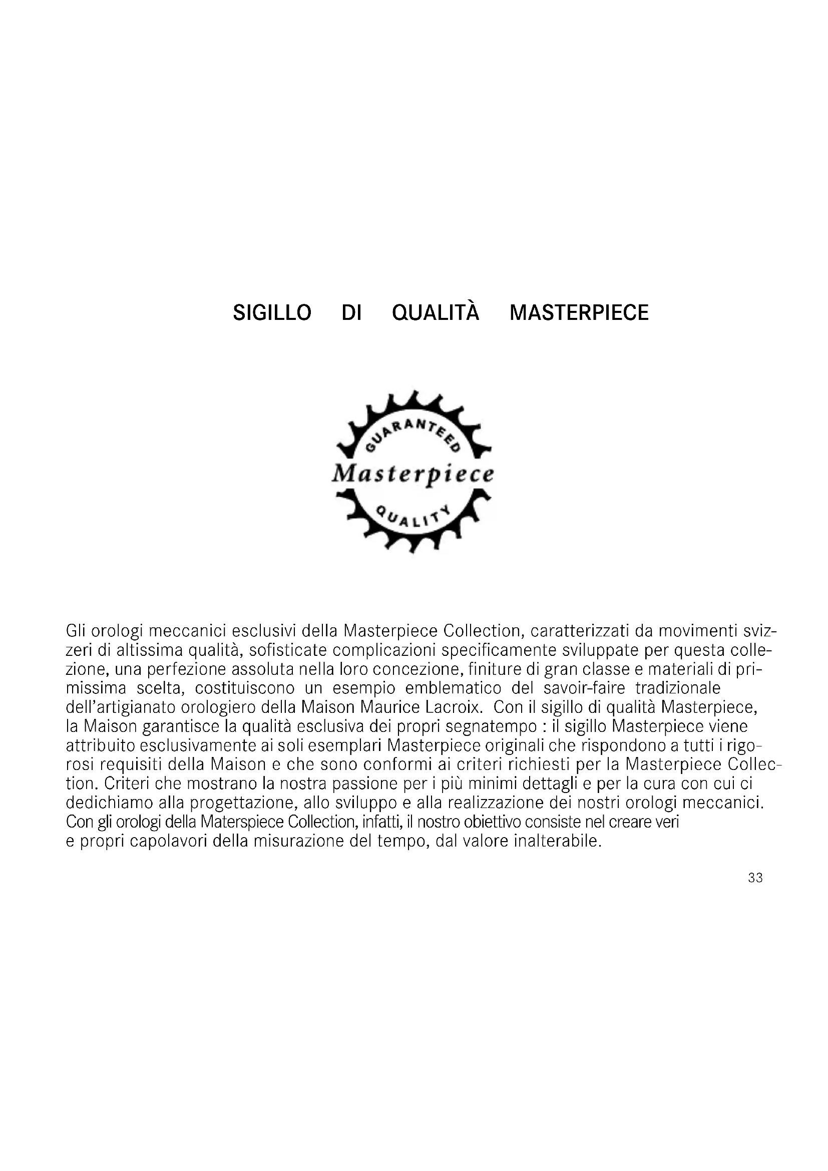 caratteristiche tecniche MOvIMENTO : Calibro ML104, meccanico a carica manuale. FUNZIONI : Indicazione delle ore, dei minuti, dei secondi, del calendario retrogrado, delle fasi lunari e del giorno della settimana, della riserva di carica. ALTERNANZE : 18 000 al/ore, 2,5Hz. RISERvA DI CARICA : 48 ore. NUMERO DI RUBINI : 35. CONTROLLO PRECISIONE : In 5 posizioni dopo carica completa e dopo 24 ore. COMPONENTI : Tutti i componenti sono certicati dai nostri maestri orologiai e hanno quindi superato tutti i test di qualità Maurice Lacroix. DECORAZIONE : Minuziosamente decorato a mano e personalizzato secondo il design della collezione.36 LEGENDA A Lancetta dei minuti B Lancetta delle ore C Lancetta del calendario D Lancetta della riserva di carica E Lancetta dei giorni F Fase lunare G Corona H Pulsante fase lunare I Pulsante dei giorni J Pulsante del calendario istruZioni37 Corona movimento G Posizione 1 : Posizione normale, di carica. Posizione 2 : Regolazione precisa dell’ora. Regolazione dell’ora : istruzioni per l’uso – Caricare manualmente l’orologio facendo ruotare la corona (G). Durante questa operazione, si osserverà che la lancetta di riserva di carica (D) situata a ore 2 si sposta dal basso verso l’alto. È quindi possibile valutare il grado di carica della molla del bariletto : il numero o l’informazione indicata dalla lancetta rappresenta il numero di ore di funzionamento dell’orologio senza essere nuovamente caricato. Un orologio meccanico si carica preferibilmente al mattino, prima di metterlo al polso. Una corretta carica della molla, quando l’orologio è indossato, ne migliora la pre- cisione. – Estrarre la corona in posizione 2 e spostare le lancette (A) + (B) in senso orario : al passaggio della lancetta delle ore a mezzanotte (24 ore), il calendario e i giorni saltano. Continuare a spostare le lan- cette no all’ORA esatta. – Riportare la corona in posizione 1. – Con il correttore (J) situato a ore 8, spostare la lancetta del calendario retrogrado (C) no alla DATA esatta. Operazione da non effettuare tra le ore 21 e l'1 del mattino, per evitare un errato posizionamento della lancetta in seguito al funzionamento del dente d’innesto. – Con il pulsante (I) situato a ore 4, spostare la lancetta dei giorni (E) no a ottenere il GIORNO deside- rato. Operazione da non effettuare tra le ore 21 e l'1 del mattino, per evitare un errato posizionamento della lancetta in seguito al funzionamento del dente d’innesto. – Con il pulsante (H) situato a ore 3.30 (ovvero tra la corona G e il pulsante I), spostare la FASE LUNARE (F) no a ottenere la fase lunare desiderata. Operazione da non effettuare tra le ore 23 e le ore 4 del mattino, per evitare un errato posiziona- mento del disco in seguito al funzionamento del dente d’innesto. Le fasi lunari si trovano nel calendario : cercare la data dell’ultima luna piena. Premere sul pulsante (H) no a quando la luna piena compare al centro della nestrella del quadrante. Quindi, premere di nuovo sul pulsante (H) tante volte quanti sono i giorni trascorsi dall’ultima luna piena. Sul nostro sito www.mauricelacroix.com è presente un calendario delle fasi lunari.38 Particolarità tecniche del movimento – Il dispositivo « Riserva di carica » è dotato di un differenziale che garantisce uno spostamento ottimale e una considerevole precisione del funzionamento. – La complicazione « Calendario retrogrado » comporta alcuni elementi inediti : innanzitutto una camma dotata di 31 dischi piccoli che garantisce il posizionamento di un braccio del calendario azionando un mobile il cui anello è segmentato. – I salti del Calendario retrogrado e dei Giorni retrogradi si effettuano in un lasso di tempo di 45 minuti. – La Fase lunare salta a ore 3 circa (del mattino).39