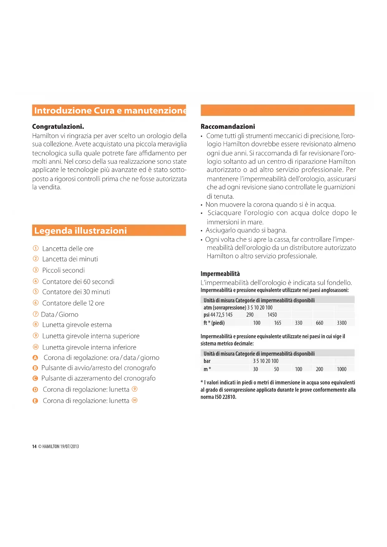 Kommt der Wind von rechts, Abdriftwinkel und mis- sweisende Peilung addieren. Kommt der Wind von links, Abdriftwinkel von misswei- sender Peilung abziehen. Beispiel: Korrigierte Richtung: 40° + 6,5° = 46,5° Die korrigierte Richtung (46,5°) kann über die Krone E auf dem unteren innen liegenden Drehring 0 festge- halten werden. Bedienungsanleitung14 © HAMILTON 19/07/2013 Introduzione Cura e manutenzione Congratulazioni. Hamilton vi ringrazia per aver scelto un orologio della sua collezione. Avete acquistato una piccola meraviglia tecnologica sulla quale potrete fare adamento per molti anni. Nel corso della sua realizzazione sono state applicate le tecnologie più avanzate ed è stato sotto- posto a rigorosi controlli prima che ne fosse autorizzata la vendita. Legenda illustrazioni 1 Lancetta delle ore 2 Lancetta dei minuti 3 Piccoli secondi 4 Contatore dei 60 secondi 5 Contatore dei 30 minuti 6 Contatore delle 12 ore 7 Data / Giorno 8 Lunetta girevole esterna 9 Lunetta girevole interna superiore 0 Lunetta girevole interna inferiore A Corona di regolazione: ora / data / giorno B Pulsante di avvio/arresto del cronografo C Pulsante di azzeramento del cronografo D Corona di regolazione: lunetta 9 E Corona di regolazione: lunetta 0 Raccomandazioni