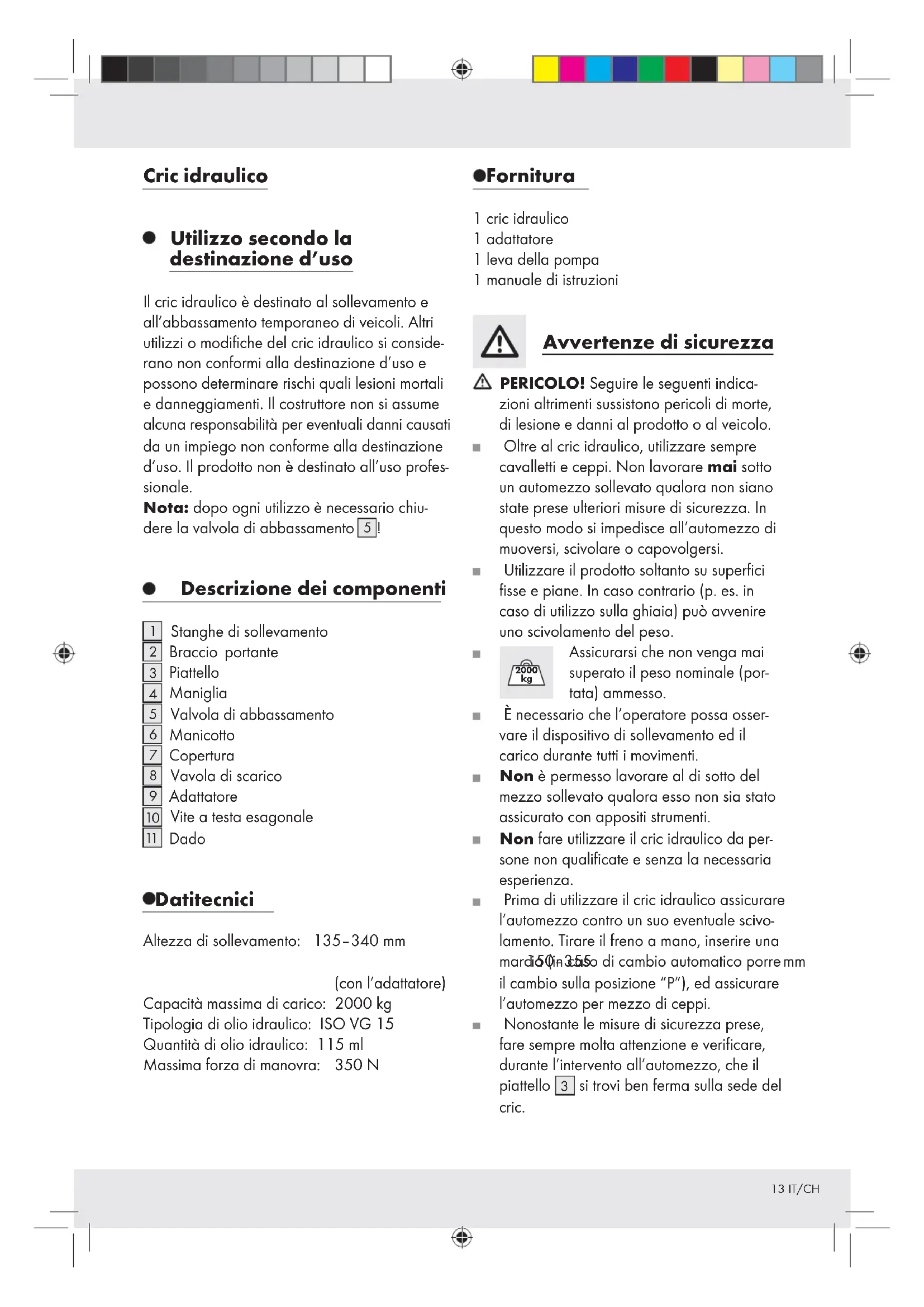 Dado Dati tecnici Altezza di sollevamento: 135–340 mm 150–355 mm (con l’adattatore) Capacità massima di carico: 2000 kg Tipologia di olio idraulico: ISOVG15 Quantità di olio idraulico: 115 ml Massima forza di manovra: 350 N Fornitura 1 cric idraulico 1 adattatore 1 leva della pompa 1 manuale di istruzioni Avvertenze di sicurezza PERICOLO! Seguire le seguenti indica- zioni altrimenti sussistono pericoli di morte, di lesione e danni al prodotto o al veicolo. Oltre al cric idraulico, utilizzare sempre cavalletti e ceppi. Non lavorare mai sotto un automezzo sollevato qualora non siano state prese ulteriori misure di sicurezza. In questo modo si impedisce all’automezzo di muoversi, scivolare o capovolgersi. Utilizzare il prodotto soltanto su superfici fisse e piane. In caso contrario (p. es. in caso di utilizzo sulla ghiaia) può avvenire uno scivolamento del peso.