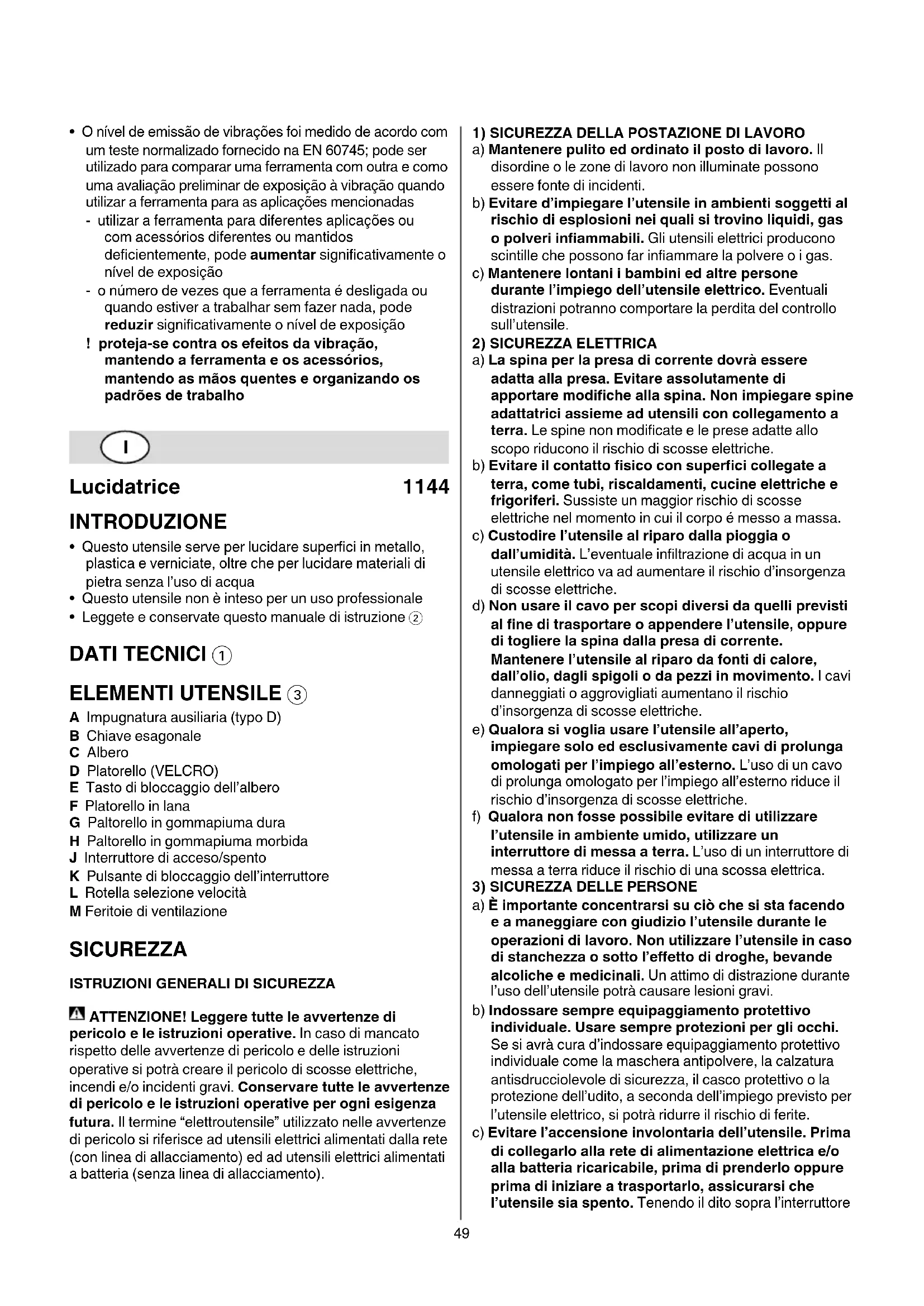 a) Questo elettroutensile è previsto per essere utilizzato come lucidatrice. Attenersi a tutte le avventenze di pericololo, istruzioni, rappresentazioni e dati che si ricevono insieme all' elettroutensile. In caso di mancata osservanza delle seguenti istruzioni vi è il pericololo di provocare una scossa elettrica, di sviluppare incendi e/o di provocare seri incidenti.