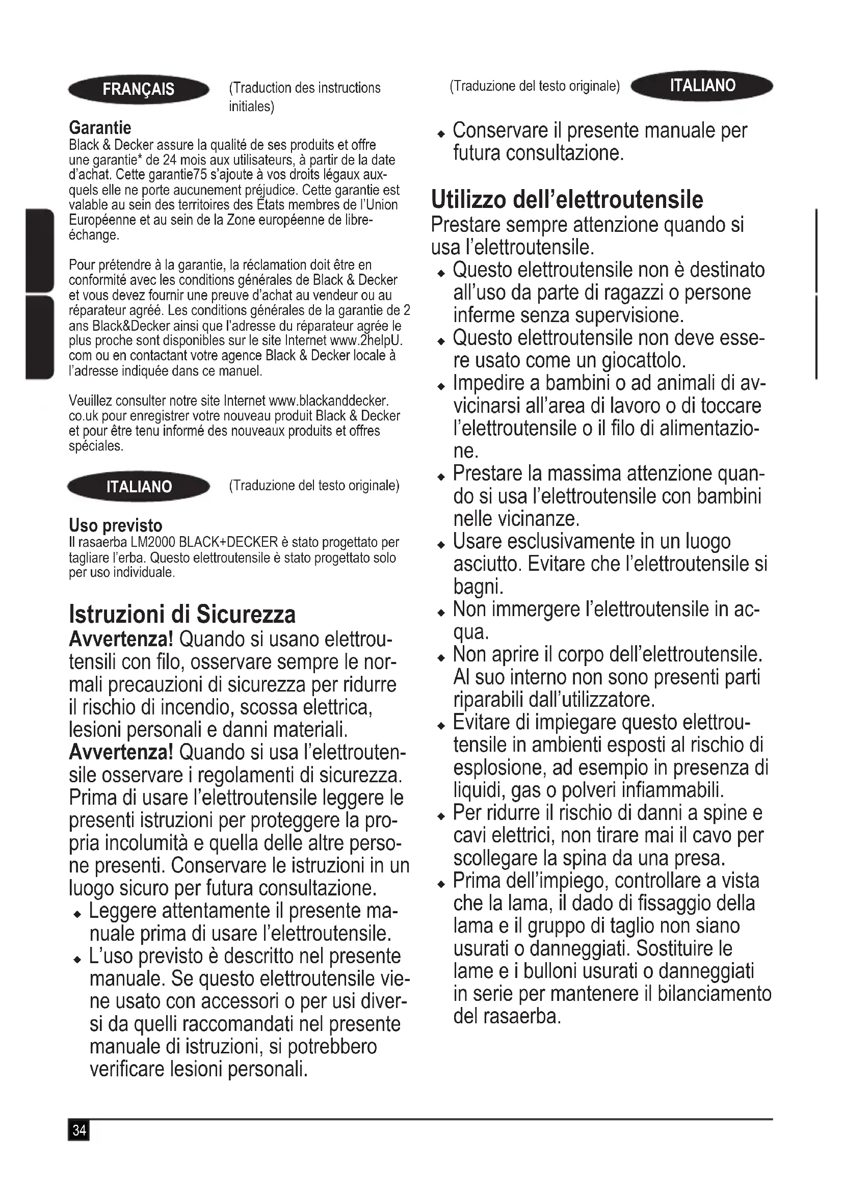 (puissance sonore garantie) 96 dB(A) Ces produits sont également conformes aux Directives 2014/30/UE et 2011/65/UE. Pour plus de détails, veuillez contacter Black & Decker à l’adresse suivante ou vous reporter au dos du manuel. Le soussigné est responsable des données de la che tech- nique et fait cette déclaration au nom de Black & Decker. R. Laverick Directeur Ingénierie Black & Decker Europe, 210 Bath Road, Slough, Berkshire, SL1 3YD Royaume-Uni 26/08/201634 (Traduction des instructions initiales) FRANÇAIS (Traduzione del testo originale) ITALIANO Garantie Black & Decker assure la qualité de ses produits et offre une garantie* de 24 mois aux utilisateurs, à partir de la date d’achat. Cette garantie75 s’ajoute à vos droits légaux aux- quels elle ne porte aucunement préjudice. Cette garantie est valable au sein des territoires des États membres de l’Union Européenne et au sein de la Zone européenne de libre- échange. Pour prétendre à la garantie, la réclamation doit être en conformité avec les conditions générales de Black & Decker et vous devez fournir une preuve d’achat au vendeur ou au réparateur agréé. Les conditions générales de la garantie de 2 ans Black&Decker ainsi que l’adresse du réparateur agrée le plus proche sont disponibles sur le site Internet www.2helpU. com ou en contactant votre agence Black & Decker locale à l’adresse indiquée dans ce manuel. Veuillez consulter notre site Internet www.blackanddecker. co.uk pour enregistrer votre nouveau produit Black & Decker et pour être tenu informé des nouveaux produits et offres spéciales. (Traduzione del testo originale) ITALIANO Uso previsto Il rasaerba LM2000 BLACK+DECKER è stato progettato per tagliare l’erba. Questo elettroutensile è stato progettato solo per uso individuale. Istruzioni di Sicurezza Avvertenza! Quando si usano elettrou- tensili con lo, osservare sempre le nor- mali precauzioni di sicurezza per ridurre il rischio di incendio, scossa elettrica, lesioni personali e danni materiali. Avvertenza! Quando si usa l’elettrouten- sile osservare i regolamenti di sicurezza. Prima di usare l’elettroutensile leggere le presenti istruzioni per proteggere la pro- pria incolumità e quella delle altre perso- ne presenti. Conservare le istruzioni in un luogo sicuro per futura consultazione. u Leggere attentamente il presente ma- nuale prima di usare l’elettroutensile. u L’uso previsto è descritto nel presente manuale. Se questo elettroutensile vie- ne usato con accessori o per usi diver- si da quelli raccomandati nel presente manuale di istruzioni, si potrebbero vericare lesioni personali. u Conservare il presente manuale per futura consultazione. Utilizzo dell’elettroutensile Prestare sempre attenzione quando si usa l’elettroutensile. u Questo elettroutensile non è destinato all’uso da parte di ragazzi o persone inferme senza supervisione. u Questo elettroutensile non deve esse- re usato come un giocattolo. u Impedire a bambini o ad animali di av- vicinarsi all’area di lavoro o di toccare l’elettroutensile o il lo di alimentazio- ne. u Prestare la massima attenzione quan- do si usa l’elettroutensile con bambini nelle vicinanze. u Usare esclusivamente in un luogo asciutto. Evitare che l’elettroutensile si bagni. u Non immergere l’elettroutensile in ac- qua. u Non aprire il corpo dell’elettroutensile. Al suo interno non sono presenti parti riparabili dall’utilizzatore. u Evitare di impiegare questo elettrou- tensile in ambienti esposti al rischio di esplosione, ad esempio in presenza di liquidi, gas o polveri inammabili. u Per ridurre il rischio di danni a spine e cavi elettrici, non tirare mai il cavo per scollegare la spina da una presa. u Prima dell’impiego, controllare a vista che la lama, il dado di ssaggio della lama e il gruppo di taglio non siano usurati o danneggiati. Sostituire le lame e i bulloni usurati o danneggiati in serie per mantenere il bilanciamento del rasaerba.35 (Traduzione del testo originale) ITALIANO u Per evitare i rischi associati aI reset- taggio accidentale dell’interruttore termico di protezione, questo elettro- utensile non deve essere alimentato attraverso un dispositivo di commu- tazione esterno, come un timer, né essere collegato a un circuito attivato o disattivato dal gestore del servizio elettrico. Dopo l’uso u Quando non viene usato, l’elettrouten- sile deve essere riposto in un luogo asciutto e ben ventilato, fuori dalla por- tata dei bambini. u Gli elettroutensili stoccati non devono essere accessibili ai bambini. u Se conservato o trasportato all’interno un veicolo, l’elettroutensile deve esse- re riposto nel bagagliaio o legato per evitare che si sposti in caso di cambia- mento repentino della velocità o della direzione di marcia. Ispezione e riparazioni u Prima dell’uso, vericare che l’elettro- utensile non sia danneggiato e non presenti parti difettose. Controllare che non siano presenti parti rotte, interrut- tori danneggiati o altre condizioni che potrebbero incidere sul suo funziona- mento. u Non usare l’elettroutensile se alcune parti sono danneggiate o difettose. u Far riparare o sostituire le parti dan- neggiate o difettose da un tecnico autorizzato. u Non tentare di smontare o sostituire delle parti, ad eccezione di quelle spe- cicate nel presente manuale. u Prestare attenzione durante la rego- lazione del rasaerba, per prevenire lo schiacciamento delle dita tra le lame/ parti in movimento e le parti sse dell’elettroutensile. u Quando si esegue la manutenzione delle lame, tenere presente che, anche se l’alimentazione elettrica è scolle- gata, le lame potrebbero comunque ruotare. Precauzioni di sicurezza aggiun- tive per i rasaerba u Durante l’uso del rasaerba afferrare saldamente il manico con entrambe le mani. u Se in qualsiasi momento dovesse essere necessario inclinare il rasa- erba, tenere entrambe le mani nella posizione di lavoro mentre lo si inclina. Tenere entra