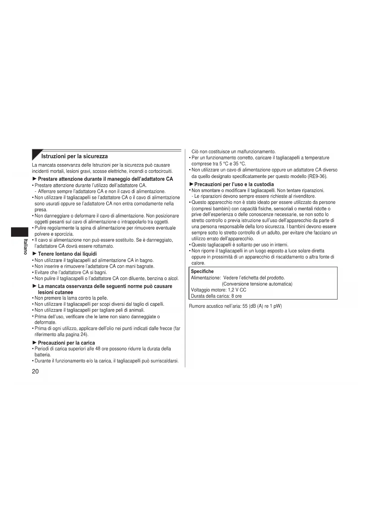 Ciò non costituisce un malfunzionamento. Per un funzionamento corretto, caricare il tagliacapelli a temperature comprese tra 5 °C e 35 °C. Non utilizzare un cavo di alimentazione oppure un adattatore CA diverso da quello designato specicatamente per questo modello (RE9‑36). Precauzioni per l’uso e la custodia Non smontare o modicare il tagliacapelli. Non tentare riparazioni. Le riparazioni devono sempre essere richieste al rivenditore. Questo apparecchio non è stato ideato per essere utilizzato da persone (compresi bambini) con capacità siche, sensoriali o mentali ridotte o prive dell’esperienza o delle conoscenze necessarie, se non sotto lo stretto controllo o previa istruzione sull’uso dell’apparecchio da parte di una persona responsabile della loro sicurezza. I bambini devono essere sempre sotto lo stretto controllo di un adulto, per evitare che facciano un utilizzo errato dell’apparecchio. Questo tagliacapelli è soltanto per uso in interni. Non riporre il tagliacapelli in un luogo esposto a luce solare diretta oppure in prossimità di un apparecchio di riscaldamento o altra fonte di calore. Speciche Alimentazione: Vedere l’etichetta del prodotto. (Conversione tensione automatica) Voltaggio motore: 1,2 V CC Durata della carica: 8 ore Rumore acustico nell’aria: 55 (dB (A) re 1 pW)