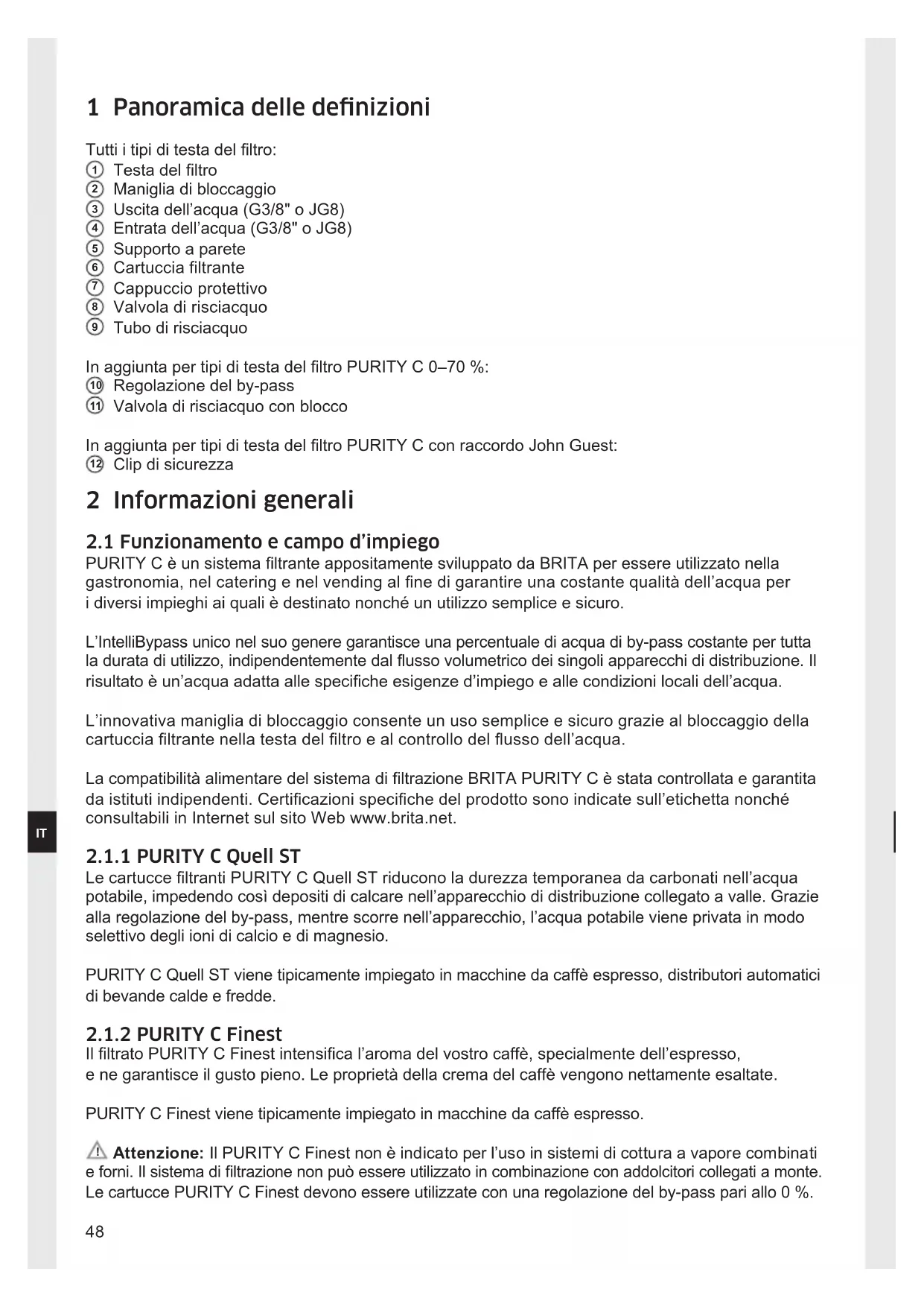 Attenzione: Il PURITY C Finest non è indicato per l’uso in sistemi di cottura a vapore combinati e forni. Il sistema di ltrazione non può essere utilizzato in combinazione con addolcitori collegati a monte. Le cartucce PURITY C Finest devono essere utilizzate con una regolazione del by-pass pari allo 0 %.49