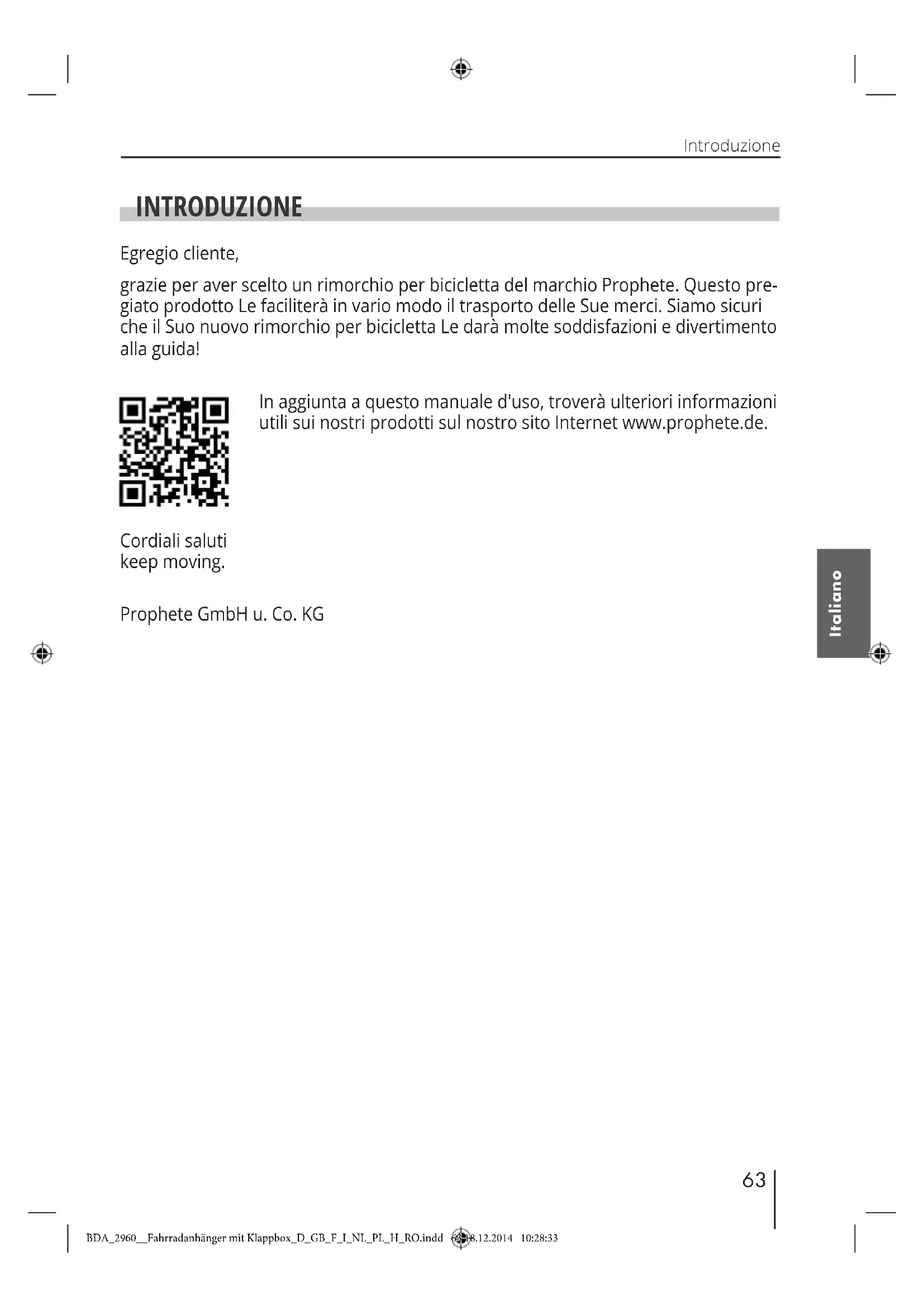 grazie per aver scelto un rimorchio per bicyclicetta del marchio Prophete. Questo pregiato prodotto Le facilititerà in vario modo il trasporto delle Sue merci. Siamo sicuri che il Suo nuovo rimorchio per bicyclicta Le darà molte soddisfazioni e divertimento alla guida!