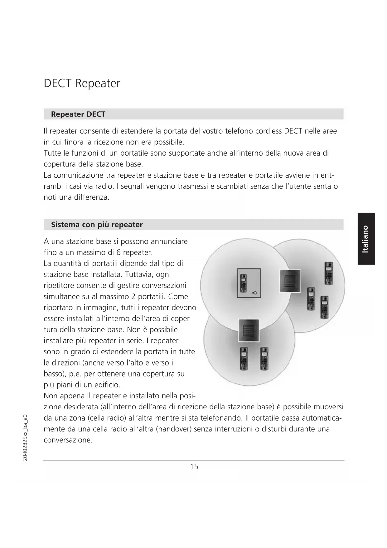 www.swisscom.com, rubrica «Online-Shop, Telefoni, Dichiarazioni di conformità». La conformità con la direttiva sopra menzionata è confermata dal marchio CE. Garanzia Il vostro apparecchio è coperto da garanzia a partire dalla data di acquisto, nei limiti delle disposizioni legali vigenti nel Paese in cui è stato acquistato. Quale dimostrazione della data di acquisto vi preghiamo di conservare il giustificativo (scontrino, fattura). Nel periodo di garanzia vengono eliminati gratuitamente tutti i guasti derivanti da difetti di materiale e di fabbricazione. La prestazione di garanzia avviene tramite riparazione oppure sostituzione dell‘apparecchio guasto, su decisione del fornitore. Non sono coperti dalla garanzia il materiale di consumo e i difetti che riducono in modo irrilevante il valore o l‘uso dell‘apparecchio, nonché i guasti che derivano da uso impro- prio, usura o interventi effettuati da terzi. Sono esclusi da questa garanzia eventuali danni consecutivi dovuti all‘uso dell‘apparecchio, guasti o difetti del prodotto; si declina in particolare ogni responsabilità per danni patrimoniali. In caso di guasto coperto da garanzia vi preghiamo di rivolgervi al punto vendita presso il quale avete acquistato l‘apparecchio. DECT Repeater21 20402825xx_ba_a0 DECT Repeater English DECT Repeater A repeater is used when you need to extend the range of your cordless DECT telephone to include areas where reception was previously not available. All the usual mobile unit functions are supported by the base station in this extended radio range. The repeater and base station have wireless connections with each other, just as the repeater and handset have wireless connections. Signals are exchanged without the user hearing or noticing the difference. System with multiple repeaters Up to 6 repeaters can be registered at a base station. The number of mobile units to be operated only depends on the type of the base station installed. However, the number of simultaneous calls is limited to 2. All repeaters must be installed within the base stations coverage area, as shown in the drawings. It is not possible to install repeaters in series. The repeaters can be used to extend the coverage area in all directions – including up and down (e.g. to cover several floors in a building). If the repeaters are placed correctly (overlap- ping the coverage area of the base station), you can go from one area (cell) to the other while speaking on the mobile unit. The mobile unit will automatically switch from cell to cell (handover), without this being noticed during the telephone call.22 20402825xx_ba_a0 Before the repeater is installed, the repeater mode in the base station must be activated