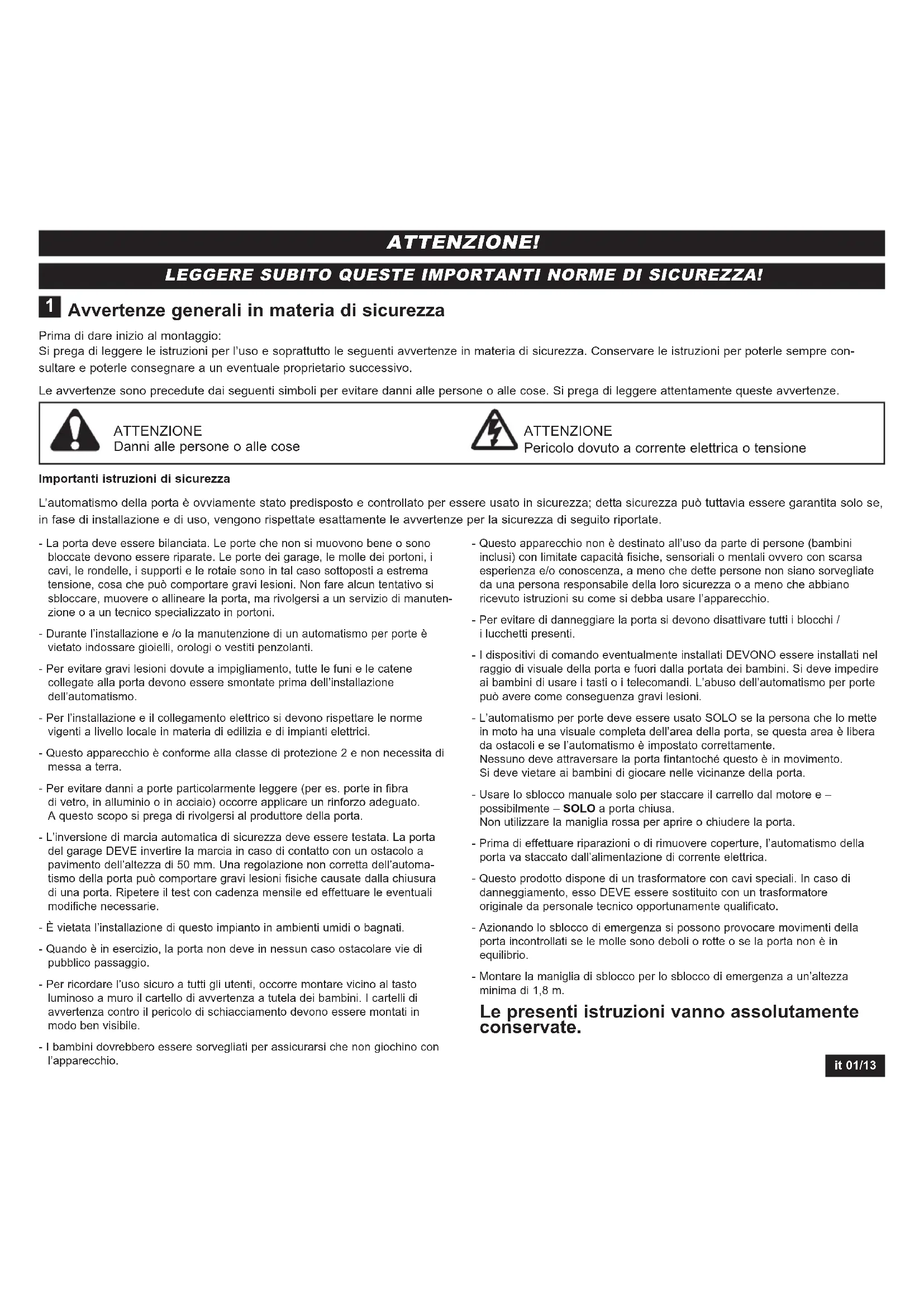 - 37 Dichiarazione di conformità it 01/13 Avvertenze generali in materia di sicurezza Prima di dare inizio al montaggio: Si prega di leggere le istruzioni per l’uso e soprattutto le seguenti avvertenze in materia di sicurezza. Conservare le istruzioni per poterle sempre con- sultare e poterle consegnare a un eventuale proprietario successivo. Le avvertenze sono precedute dai seguenti simboli per evitare danni alle persone o alle cose. Si prega di leggere attentamente queste avvertenze. Importanti istruzioni di sicurezza L’automatismo della porta è ovviamente stato predisposto e controllato per essere usato in sicurezza; detta sicurezza può tuttavia essere garantita solo se, in fase di installazione e di uso, vengono rispettate esattamente le avvertenze per la sicurezza di seguito riportate. ATTENZIONE Danni alle persone o alle cose ATTENZIONE Pericolo dovuto a corrente elettrica o tensione p. 13