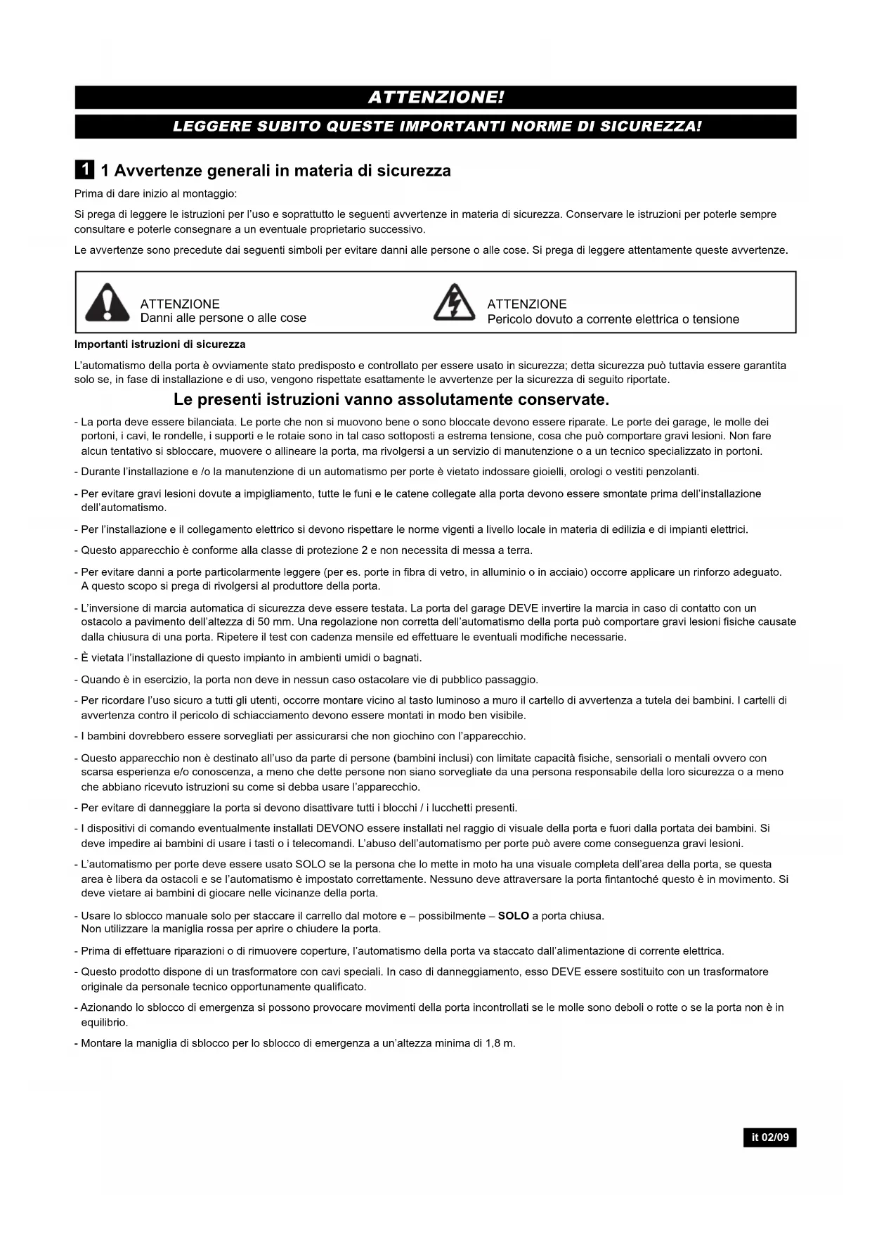 LEGGERE SUBITO QUESTE IMPORTANTI NORME DI SICUREZZA! ATTENZIONE! it 02/09Utilizzo conforme alla destinazione d’uso L’apparecchio è destinato all’apertura e alla chiusura di porte basculanti e sezionali di garage in ambito privato. L’apparecchio non è previsto per uso industriale ma esclusivamente per l’utilizzo su porte di garage privati, destinati ed idonei a un singolo nucleo familiare. Qualsiasi utilizzo non conforme alla destinazione d’uso dell’automatismo comporta notevoli rischi di inci- dente. Il produttore declina ogni responsabilità per l’utilizzo non con- forme alla destinazione d’uso Contenuto della fornitura Prima del montaggio si prega di verificare la completezza delle parti for- nite. Avvertenza: la numerazione vale soltanto per il capitolo in ques- tione. Panoramica del prodotto Questa figura vi offre sempre una panoramica completa, durante il mon- taggio passo dopo passo dell’impianto, dell’impianto stesso come sarà da montato. Prima di cominciare AVVERTENZA IMPORTANTE Se il vostro garage non dispone di un accesso laterale, occorre instal- lare uno sblocco di emergenza esterno che consenta, in caso di man- canza di corrente, di azionare manualmente la porta del garage dall’esterno. Prerequisiti L’apriporta del garage è idoneo solo al montaggio di porte di garage monoblocco con rotaia di scorrimento orizzontale (porta basculante a contrappeso) (fig. A) e per porte sezionali con rotaia di scorrimento curva (fig. B). Avvertenza: per porte di garage monoblocco con rotaie di scorrimento orizzontali e verticali e/o per porte o porte basculanti a due ante, l’impianto non può essere utilizzato. Preparazione Verificate per prima cosa se la vostra porta è bilanciata ed è in equilib- rio. Aprite la porta all’incirca fino alla metà e lasciatela andare. A questo punto la porta non dovrà spostarsi da sola quasi per nulla, ma dovrà rimanere nella sua posizione, tenuta dalla sola forza delle molle. Forza cinetica: max. 15kg.