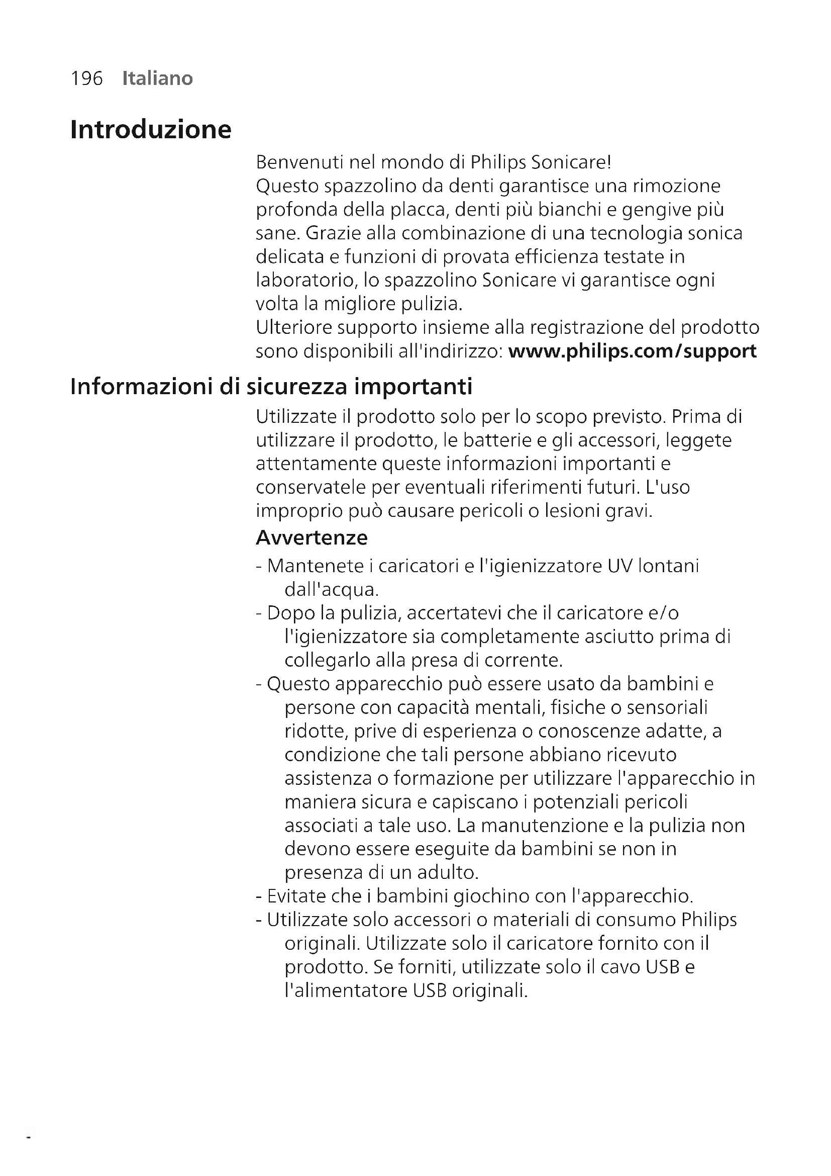 Italiano Introduzione Benvenuti nel mondo di Philips Sonicare! Questo spazzolino da denti garantisce una rimozione profonda della placca, denti più bianchi e gengive più sane. Grazie alla combinazione di una tecnologia sonica delicata e funzioni di provata efficienza testate in laboratorio, lo spazzolino Sonicare vi garantisce ogni volta la migliore pulizia. Ulteriore supporto insieme alla registrazione del prodotto sono disponibili all'indirizzo: www.philips.com/support Informazioni di sicurezza importanti Utilizzate il prodotto solo per lo scopo previsto. Prima di utilizzare il prodotto, le batterie e gli accessori, leggete attentamente queste informazioni importanti e conservatele per eventuali riferimenti futuri. L'uso improprio può causare pericoli o lesioni gravi. Avvertenze - Mantenete i caricatori e l'igienizzatore UV lontani dall'acqua. - Dopo la pulizia, accertatevi che il caricatore e/o l'igienizzatore sia completamente asciutto prima di collegarlo alla presa di corrente. - Questo apparecchio può essere usato da bambini e persone con capacità mentali, fisiche o sensoriali ridotte, prive di esperienza o conoscenze adatte, a condizione che tali persone abbiano ricevuto assistenza o formazione per utilizzare l'apparecchio in maniera sicura e capiscano i potenziali pericoli associati a tale uso. La manutenzione e la pulizia non devono essere eseguite da bambini se non in presenza di un adulto. - Evitate che i bambini giochino con l'apparecchio. - Utilizzate solo accessori o materiali di consumo Philips originali. Utilizzate solo il caricatore fornito con il prodotto. Se forniti, utilizzate solo il cavo USB e l'alimentatore USB originali.197 Italiano - Questo apparecchio non contiene parti riparabili dall'utente. Se l'apparecchio è danneggiato, smettete di utilizzarlo e contattate il Centro Assistenza Clienti del vostro Paese. Solo apparecchi con cavo: se il cavo è danneggiato, sostituite il caricatore con l'igienizzatore con uno nuovo. - Non utilizzate il caricabatterie e/o l'igienizzatore in esterni o in prossimità di superfici calde. - Non lavate i componenti del prodotto in lavastoviglie. - Questo apparecchio è destinato esclusivamente alla pulizia di denti, gengive e lingua. - Tenete sempre l'igienizzatore fuori dalla portata dei bambini. - Interrompete l'uso dell'igienizzatore se la lampadina a raggi UV rimane accesa nonostante lo sportello sia aperto. i raggi UV potrebbero essere nocivi per gli occhi e la pelle. - Utilizzate l'igienizzatore solo con lo schermo protettivo installato. - Non toccate la lampadina a raggi UV dell'igienizzatore UV se incandescente. - Non utilizzate l'apparecchio in presenza di setole rovinate o piegate. Sostituite la testina dello spazzolino ogni3 mesi o prima in presenza di segni di usura. - Evitate il contatto diretto con prodotti contenenti oli essenziali o olio di cocco. Potrebbe verificarsi il distacco delle setole. - Interrompete l'utilizzo dell'apparecchio e consultate il vostro dentista/medico in caso di eccessivo sanguinamento dopo l'uso, se il sanguinamento continua anche dopo 1 settimana di utilizzo o se avvertite fastidio o dolore. - Se nel corso degli ultimi 2 mesi vi siete sottoposti a interventi su denti o gengive, chiedete il parere del vostro dentista prima di utilizzare l'apparecchio. - I portatori di pacemaker o di altro dispositivo impiantato devono consultare il medico o il produttore del dispositivo impiantato prima dell'uso. - In caso di problemi orali, consultate il medico prima di utilizzare questo apparecchio.198 Italiano - Questo apparecchio è assolutamente personale e non deve essere utilizzato da più persone o presso studi dentistici. Istruzioni di sicurezza per le batterie - Questo apparecchio contiene batterie che possono essere rimosse solo da persone esperte. - Utilizzate il prodotto solo per lo scopo previsto. Prima di utilizzare il prodotto, le batterie e gli accessori, leggete attentamente queste informazioni e conservatele per eventuali riferimenti futuri. L'uso improprio può causare pericoli o lesioni gravi. Gli accessori forniti potrebbero variare a seconda del prodotto. - Utilizzate solo accessori e materiali di consumo Philips originali. Utilizzate solo l'alimentatore rimovibile TCBxxxx, HX6100, HX6110, HX6160 o WAAxxxx. - Tenete il prodotto e le batterie lontani dal fuoco e non esponeteli alla luce solare diretta o alle alte temperature. - Se il prodotto si surriscalda in modo anomalo, emana un odore strano, cambia colore o se la ricarica richiede più tempo del solito, interrompete l'utilizzo e la ricarica del prodotto e contattate Philips. - Non collocate i prodotti e le relative batterie in forni a microonde o su fornelli a induzione. - Per evitare che le batterie si surriscaldino o rilascino sostanze tossiche o pericolose, non aprite, modificate, perforate, danneggiate o smontate il prodotto o le batterie. Non mandate in cortocircuito, sovraccaricate o invertite la polarità delle batterie. - Questo apparecchio contiene batterie non sostituibili. Smaltite in modo adeguato l'apparecchio quando la batteria è esaurita. Consultate la sezione sul riciclo. - Se le batterie sono danneggiate o perdono del liquido, evitate il contatto con la pelle o gli occhi. In tal caso, sciacquate subito e accuratamente con acqua e consultate un medico. - Quando maneggiate le batterie, assicuratevi che le mani, il prodotto e le batterie siano asciutti.199 Italiano - Per evitare il cortocircuito accidentale delle batterie dopo la rimozione, evitate che i terminali delle batterie entrino in contatto con oggetti metallici, come monete, forcine o anelli. Non avvolgete le batterie in una pellicola di alluminio. Coprite i terminali delle batterie o riponete le batterie in un sacchetto di plastica prima di smaltirle. - Ricaricate, utilizzate e immagazzinate il prodotto a una temperatura compresa tra 0 °C e 40 °C. Condizioni di stoccaggio e trasporto Temperatura da -10°C a 60°C. Campi elettromagnetici (EMF) Questo a