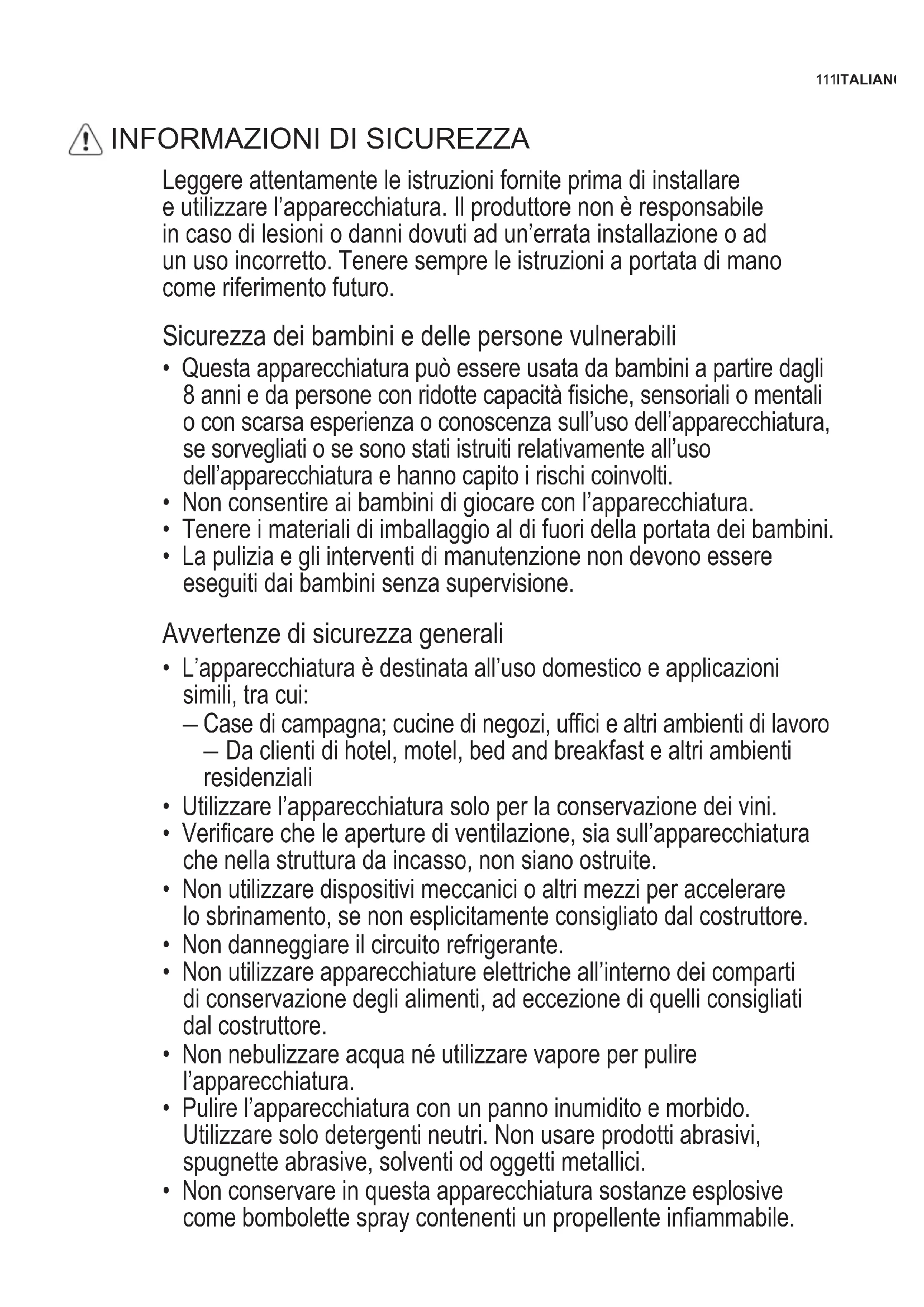 DATITECNICI....................................................................................................126 INFORMAZIONIPERGLIISTITUTIDITEST...................................................126 ASPETTIAMBIENTALI......................................................................................127111ITALIANO Leggere attentamente le istruzioni fornite prima di installare e utilizzare l’apparecchiatura. Il produttore non è responsabile in caso di lesioni o danni dovuti ad un’errata installazione o ad un uso incorretto. Tenere sempre le istruzioni a portata di mano come riferimento futuro. Sicurezza dei bambini e delle persone vulnerabili