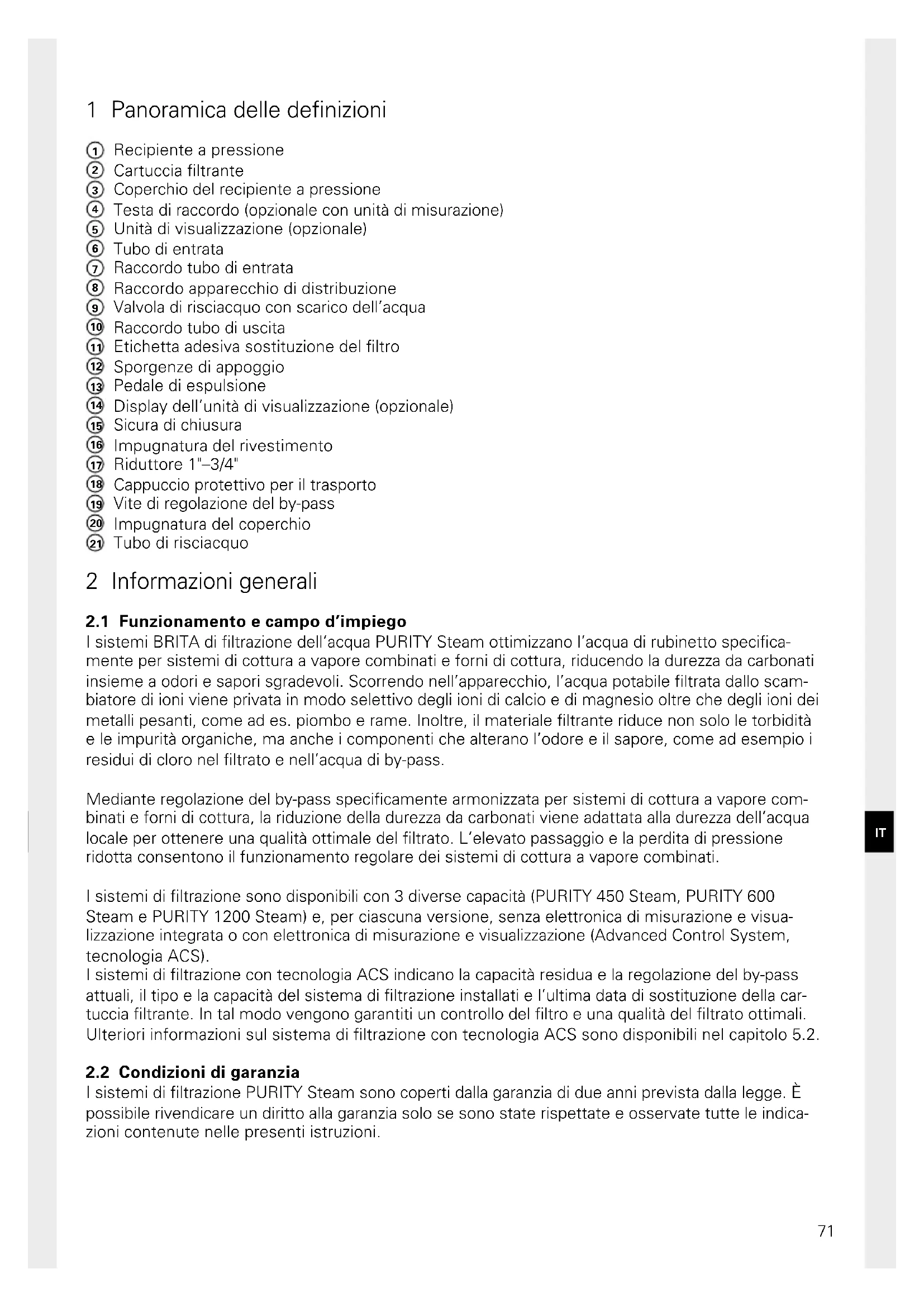 I sistemi di filtrazione PURITY Steam sono coperti dalla garanzia di due anni prevista dalla legge. È possibile rivendicare un diritto alla garanzia solo se sono state rispettate e osservate tutte le indica- zioni contenute nelle presenti istruzioni. IT72