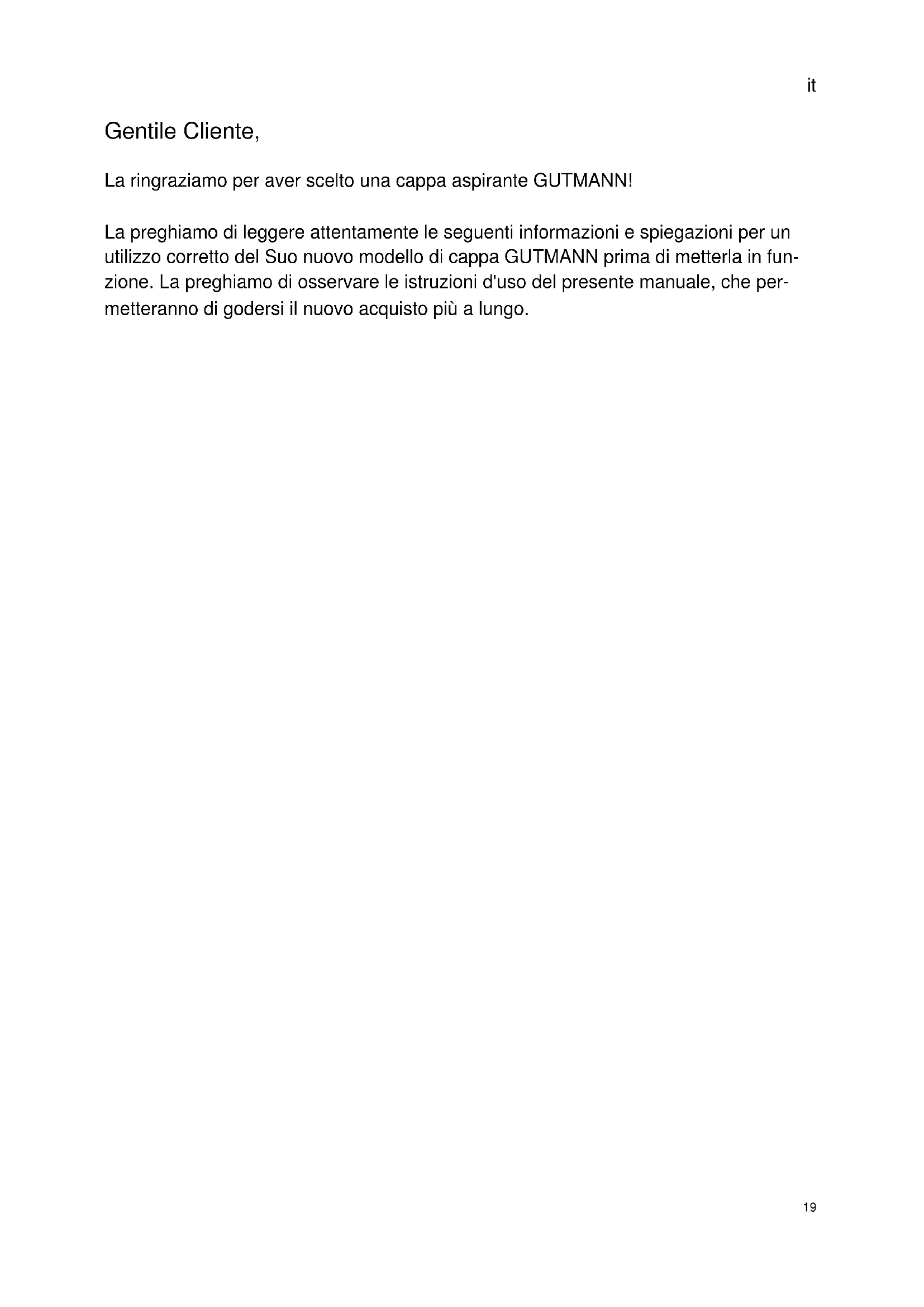 Gentile Cliente, La ringraziamo per aver scelto una cappa aspirante GUTMANN! La preghiamo di leggere attentamente le seguenti informazioni e spiegazioni per un utilizzo corretto del Suo nuovo modello di cappa GUTMANN prima di metterla in fun- zione. La preghiamo di osservare le istruzioni d'uso del presente manuale, che per- metteranno di godersi il nuovo acquisto più a lungo.it
