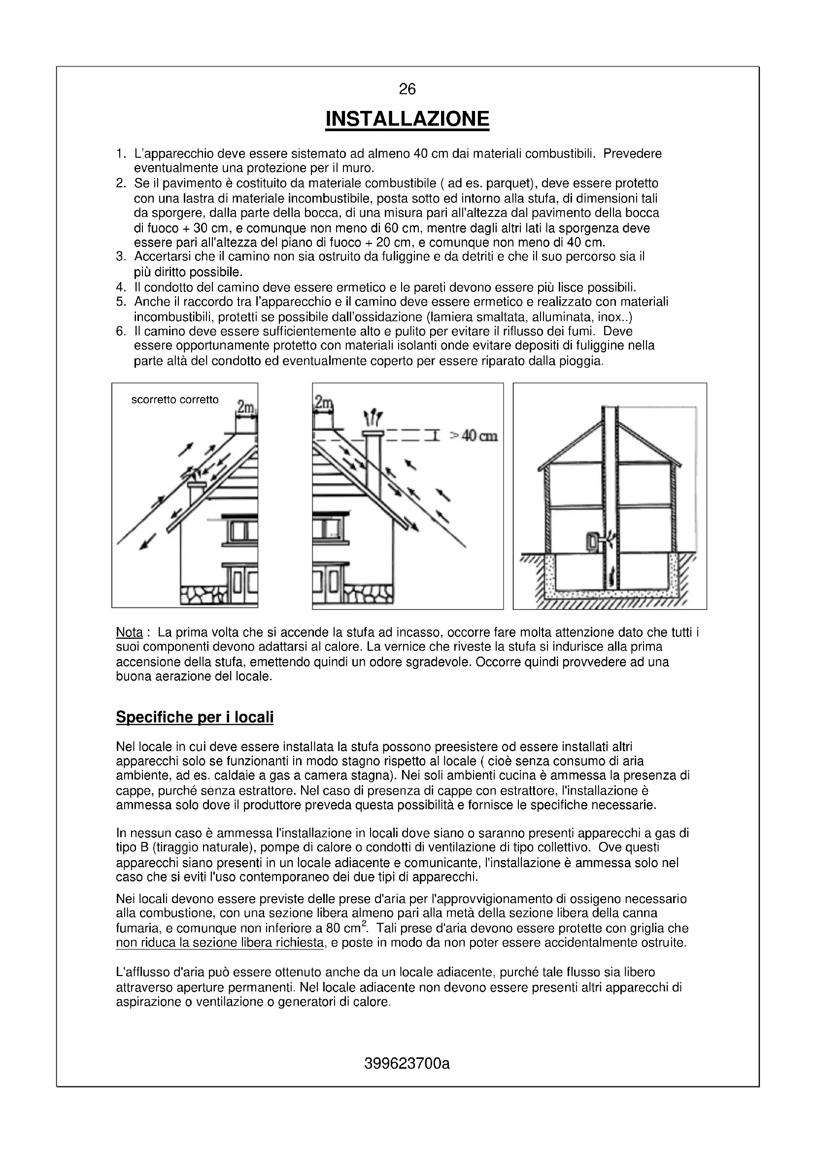 Nel locale in cui delve essere installata la stufa posso non preesistere od essere installati altri apparetti solo se funzionanti in modo stagno rispetto al locale (cioè perché consumo di aria ambiente, ad es. caldaie a gas a cameraagna). Nei soli ambienti cucina è ammessà la presenza di cappe, perché nella estrattore. Nel caso di presenza di cappe con estrattore, l'installazione èammessa solo dove il produttore prevedaquesta possibilità e fornisce le specifiche necessarie.