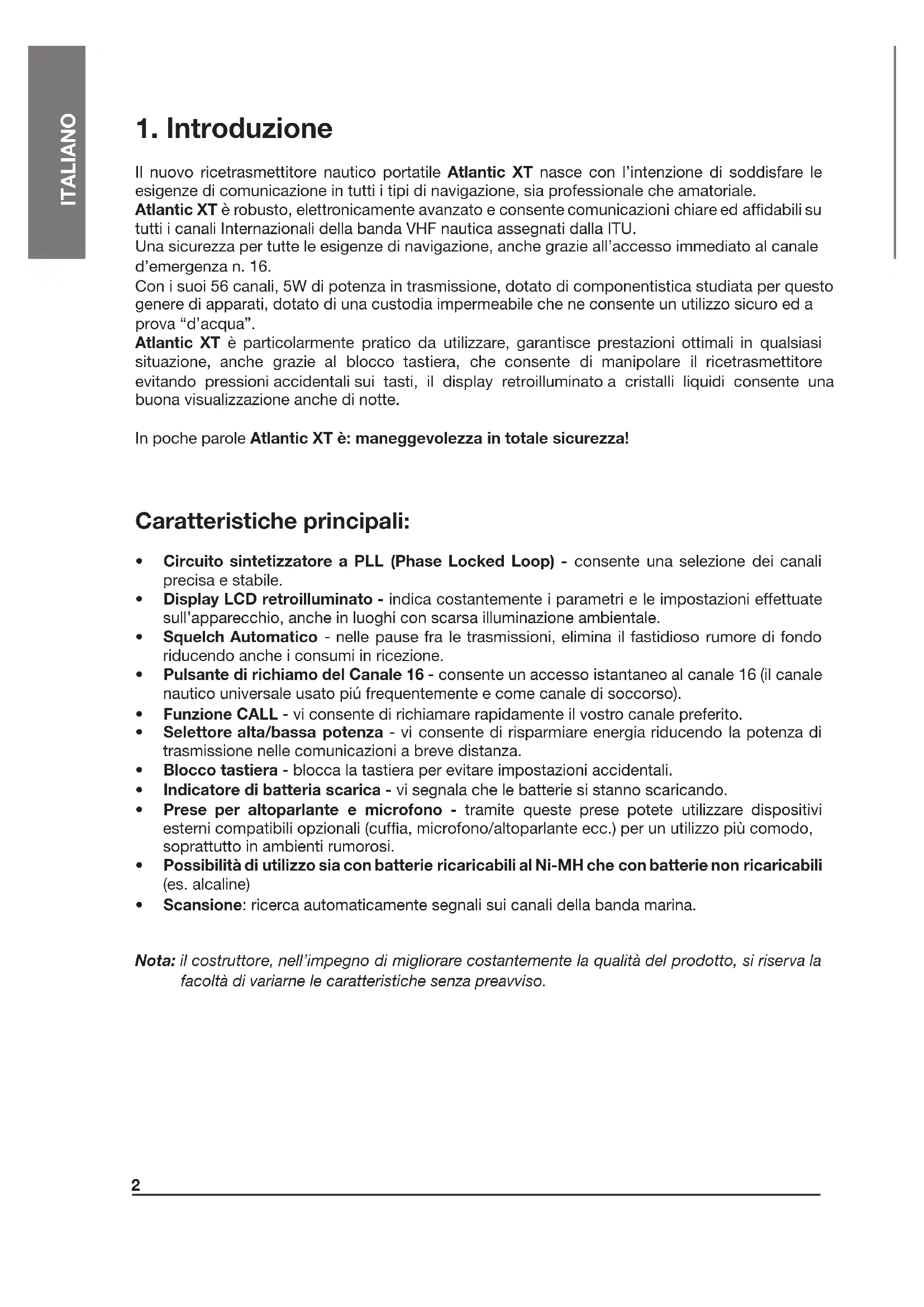 ! EVITATE DI TRASMETTERE CON L’ANTENNA DANNEGGIATA - sebbene l’apparato sia protetto, ciò può danneggiare seriamente gli stadi di potenza di trasmissione. ! Tenete l’antenna ad una distanza minima dalla vostra testa e dal corpo quando trasmettete. ! Non afferrate l’apparecchio per l’antenna! Si tratta di una parte delicata ed importante per il corretto funzionamento dell’apparato. ! ATTENZIONE ALLE CONDIZIONI AMBIENTALI - sebbene Atlantic XT sia disegnato per operare nelle condizioni più severe, far attenzione a non esporlo ad ambienti eccessivamente umidi, polverosi ed a temperature fuori della gamma da -15° a +55°C. Inoltre evitate l’esposizione a raggi solari diretti. ! EVITATE GLI URTI E VIBRAZIONI ECCESSIVE, l’apparato é fatto per sopportare urti e vibrazioni, purché contenute nella norma di qualsiasi dispositivo elettrico. ! Non utilizzate questo dispositivo e/o non sostituite le sue batterie in atmosfere potenzialmente esplosive. Una sola scintilla potrebbe causare un’esplosione. ! BATTERIE - Osservate tutte le precauzioni sull’utilizzo delle batterie descritte nel cap. 4.3 e 4.4 ! NON APRITE LA RADIO PER NESSUN MOTIVO, la meccanica ed elettronica di precisione di cui é composto l’apparato richiede esperienza e strumentazione; per lo stesso motivo non va assolutamente riallineata la radio, che é già stata tarata in fabbrica per le massime prestazioni. L’apertura del ricetrasmettitore da parte di personale non autorizzato farà decadere automaticamente la garanzia. ! Non utilizzate alcool, solventi o abrasivi per pulire l’apparecchio. Utilizzate solo un panno morbido e pulito leggermente inumidito con acqua. Nei casi più tenaci utilizzate un blando detergente. ! Il vostro ricetrasmettitore portatile marino VHF incorpora un trasmettitore radio. Siate consci che, quando premete il pulsante PTT, state emettendo segnali a radio frequenza (RF). ! Il ricetrasmettitore va utilizzato esclusivamente con tutte le protezioni ed i coperchi perfettamente in sede (es. protezione presa MIC/CHG e coperchio del vano batterie).