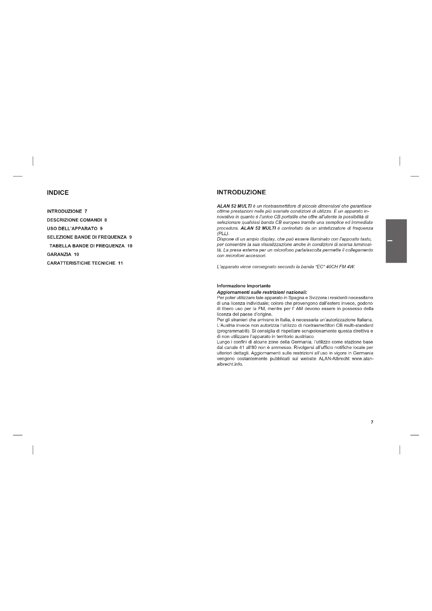 GARANZIA 10 CARATTERISTICHE TECNICHE 11 INTRODUZIONE ALAN 52 MULTI è un ricetrasmettitore di piccole dimensioni che garantisce ottime prestazioni nelle più svariate condizioni di utilizzo. È un apparato in- novativo in quanto è l’unico CB portatile che offre all’utente la possibilità di selezionare qualsiasi banda CB europea tramite una semplice ed immediata procedura. ALAN 52 MULTI è controllato da un sintetizzatore di frequenza (PLL). Dispone di un ampio display, che può essere illuminato con l’apposito tasto, per consentire la sua visualizzazione anche in condizioni di scarsa luminosi- tà. La presa esterna per un microfono parla/ascolta permette il collegamento con microfoni accessori. L’apparato viene consegnato secondo la banda “EC“ 40CH FM 4W. Informazione importante Aggiornamenti sulle restrizioni nazionali: Per poter utilizzare tale apparato in Spagna e Svizzera i residenti necessitano di una licenza individuale; coloro che provengono dall’estero invece, godono di libero uso per la FM, mentre per l’ AM devono essere in possesso della licenza del paese d’origine. Per gli stranieri che arrivano in Italia, è necessaria un’autorizzazione Italiana. L’Austria invece non autorizza l’utilizzo di ricetrasmettitori CB multi-standard (programmabili). Si consiglia di rispettare scrupolosamente questa direttiva e di non utilizzare l’apparato in territorio austriaco. Lungo i confini di alcune zone della Germania, l’utilizzo come stazione base dal canale 41 all’80 non è ammesso. Rivolgersi all’ufficio notifiche locale per ulteriori dettagli. Aggiornamenti sulle restrizioni all’uso in vigore in Germania vengono costantemente pubblicati sul website ALAN-Albrecht www.alan- albrecht.info.8 CONTENUTO › 1 ricetrasmettitore CB portatile › adattatore per uso in auto con presa per antenna esterna DESCRIZIONE COMANDI