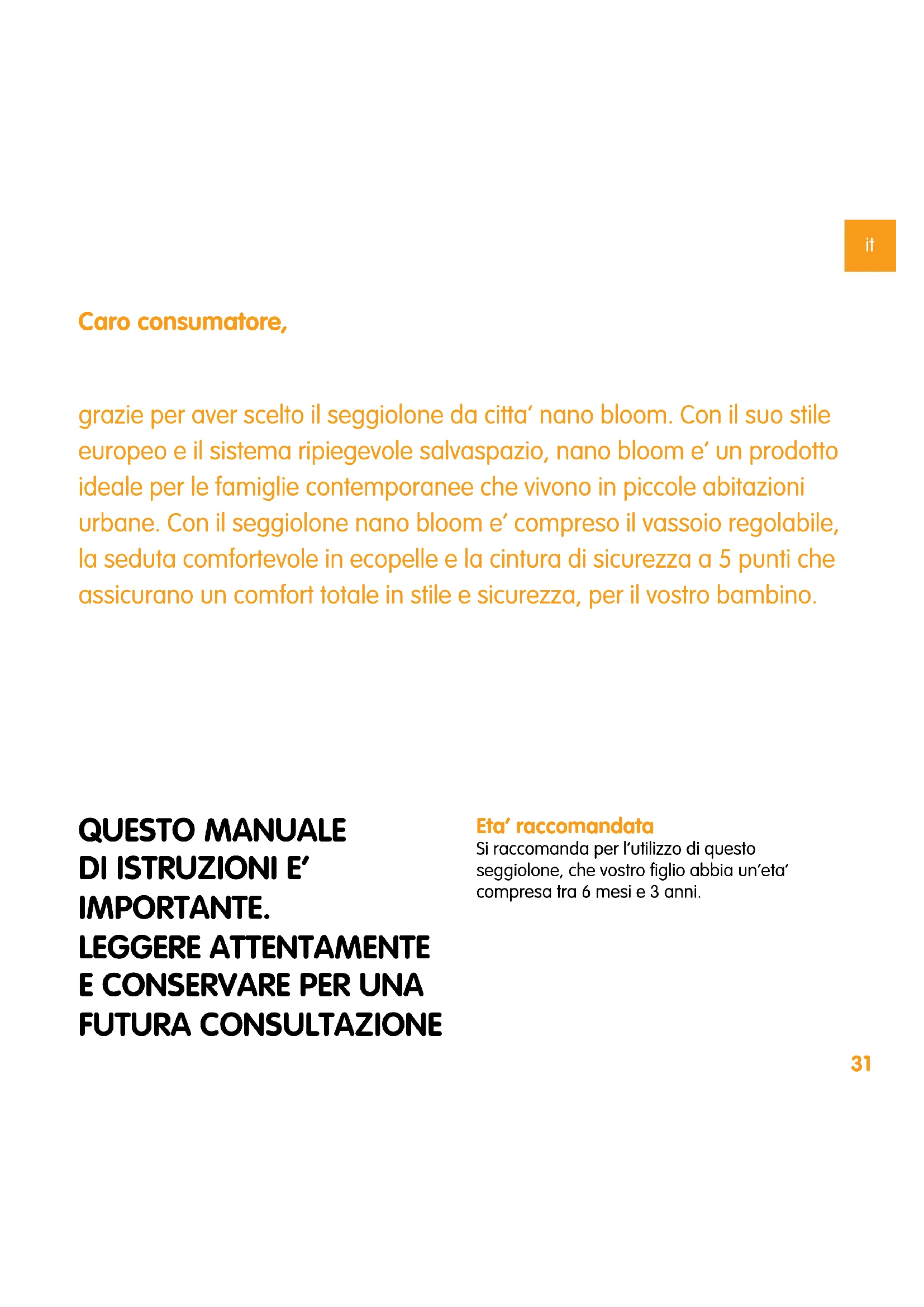 grazie per aver scelto il seggiolone da citta' nano bloom. Con il suo stile europeo e il sistema ripiegevole salvaspazio, nano bloom e' un prodotto ideale per le famiglie contemporanee che vivono in piccole abitazioni urbane. Con il seggiolone nano bloom e' compreso il vassoio regolabile, la seduta comfortevole in ecopelle e la cintura di sicurezza a 5 punti che assicurano un comfort totale in stile e sicurezza, per il vostro bambino.