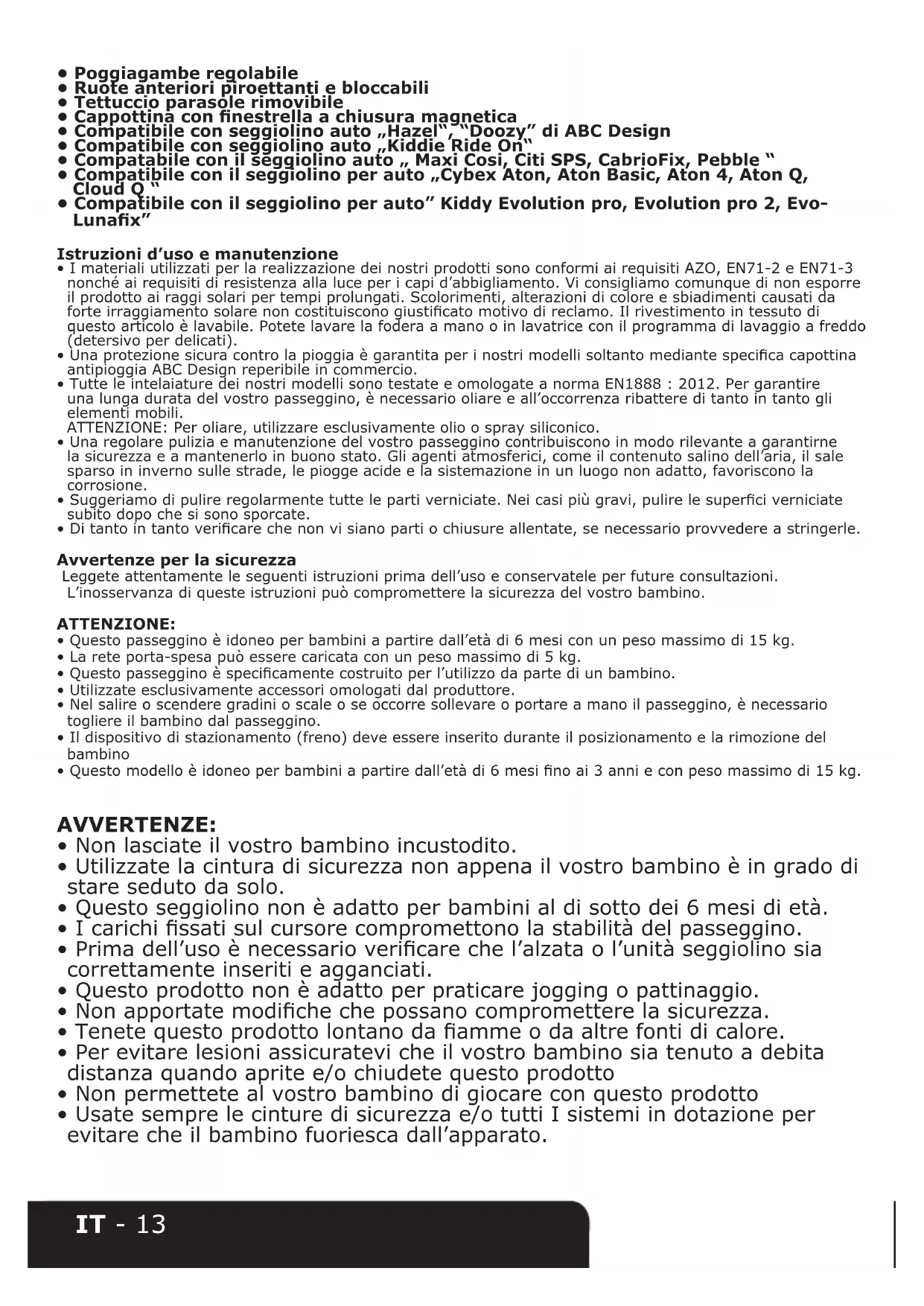 - Di tanto in tanto vericare che non vi siano parti o chiusure allentate, se necessario provvedere a stringerle. Avvertenze per la sicurezza Leggete attentamente le seguenti istruzioni prima dell’uso e conservatele per future consultazioni. L’inosservanza di queste istruzioni può compromettere la sicurezza del vostro bambino. ATTENZIONE: