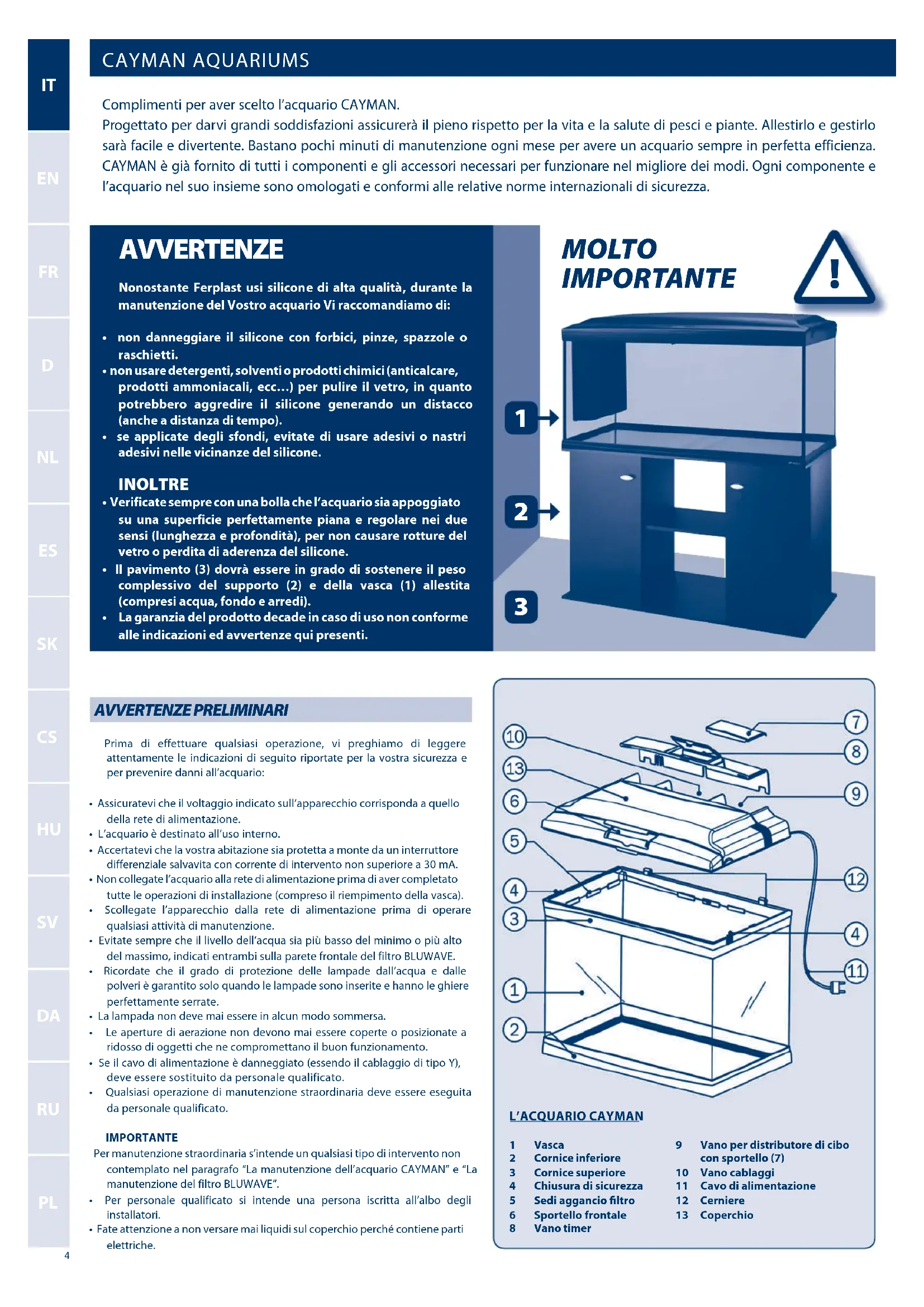 Progettato per darvi grandi soddisfazioni assicurerà il pieno rispetto per la vita e la salute di pesci e piante. Allestirlo e gestirlo sarà facile e divertente. Bastano pochi minuti di manutenzione ogni mese per avere un acquario sempre in perfetta efficienza. CAYMAN è già fornito di tutti i componenti e gli accessori necessari per funzionare nel migliore dei modi. Ogni componente e l'acquario nel suo insieme sono omologati e conformi alle relative norme internazionali di sicurezza.
