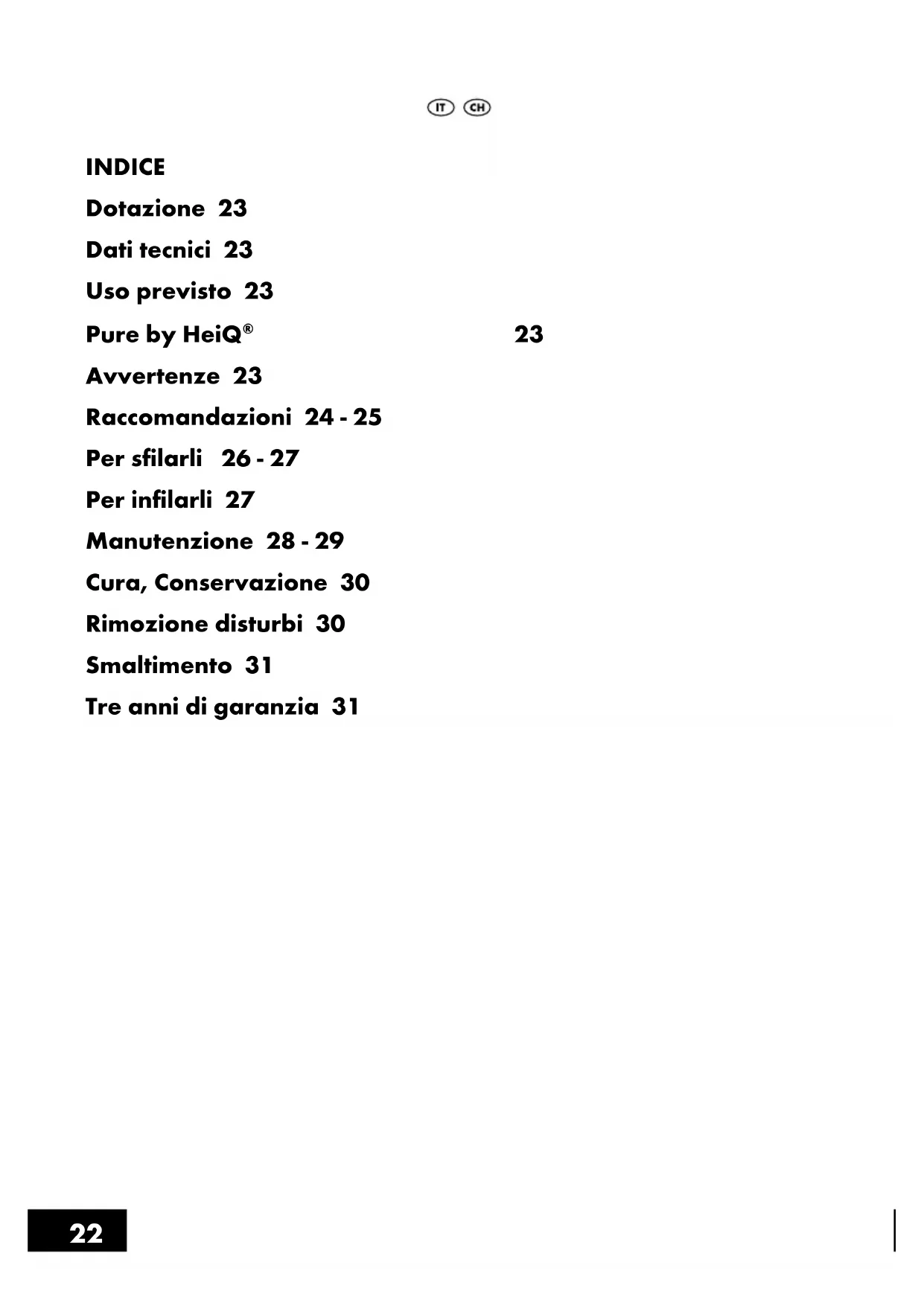 Avvertenze 23 Raccomandazioni 24 - 25 Per sfilarli 26 - 27 Per infilarli 27 Manutenzione 28 - 29 Cura, Conservazione 30 Rimozione disturbi 30 Smaltimento 31 Tre anni di garanzia 31