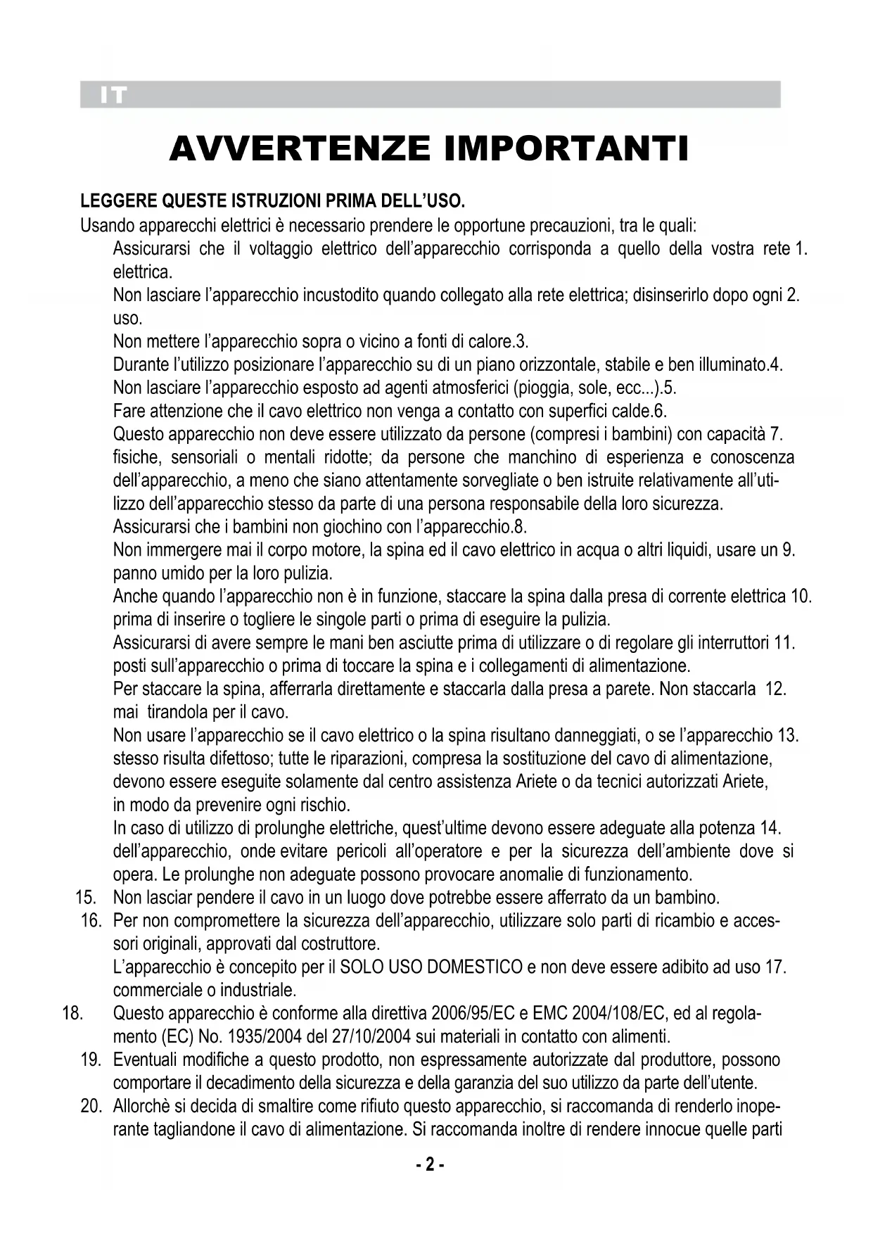 AVVERTENZE IMPORTANTI LEGGERE QUESTE ISTRUZIONI PRIMA DELL’USO. Usando apparecchi elettrici è necessario prendere le opportune precauzioni, tra le quali: Assicurarsi che il voltaggio elettrico dell’apparecchio corrisponda a quello della vostra rete 1. elettrica. Non lasciare l’apparecchio incustodito quando collegato alla rete elettrica; disinserirlo dopo ogni 2. uso. Non mettere l’apparecchio sopra o vicino a fonti di calore.3. Durante l’utilizzo posizionare l’apparecchio su di un piano orizzontale, stabile e ben illuminato.4. Non lasciare l’apparecchio esposto ad agenti atmosferici (pioggia, sole, ecc...).5. Fare attenzione che il cavo elettrico non venga a contatto con superfici calde.6. Questo apparecchio non deve essere utilizzato da persone (compresi i bambini) con capacità 7. fisiche, sensoriali o mentali ridotte; da persone che manchino di esperienza e conoscenza dell’apparecchio, a meno che siano attentamente sorvegliate o ben istruite relativamente all’uti- lizzo dell’apparecchio stesso da parte di una persona responsabile della loro sicurezza. Assicurarsi che i bambini non giochino con l’apparecchio.8. Non immergere mai il corpo motore, la spina ed il cavo elettrico in acqua o altri liquidi, usare un 9. panno umido per la loro pulizia. Anche quando l’apparecchio non è in funzione, staccare la spina dalla presa di corrente elettrica 10. prima di inserire o togliere le singole parti o prima di eseguire la pulizia. Assicurarsi di avere sempre le mani ben asciutte prima di utilizzare o di regolare gli interruttori 11. posti sull’apparecchio o prima di toccare la spina e i collegamenti di alimentazione. Per staccare la spina, afferrarla direttamente e staccarla dalla presa a parete. Non staccarla 12. mai tirandola per il cavo. Non usare l’apparecchio se il cavo elettrico o la spina risultano danneggiati, o se l’apparecchio 13. stesso risulta difettoso; tutte le riparazioni, compresa la sostituzione del cavo di alimentazione, devono essere eseguite solamente dal centro assistenza Ariete o da tecnici autorizzati Ariete, in modo da prevenire ogni rischio. In caso di utilizzo di prolunghe elettriche, quest’ultime devono essere adeguate alla potenza 14. dell’apparecchio, onde evitare pericoli all’operatore e per la sicurezza dell’ambiente dove si opera. Le prolunghe non adeguate possono provocare anomalie di funzionamento. Non lasciar pendere il cavo in un luogo dove potrebbe essere afferrato da un bambino.15. Per non compromettere la sicurezza dell’apparecchio, utilizzare solo parti di ricambio e acces-16. sori originali, approvati dal costruttore. L’apparecchio è concepito per il SOLO USO DOMESTICO e non deve essere adibito ad uso 17. commerciale o industriale. Questo apparecchio è conforme alla direttiva 2006/95/EC e EMC 2004/108/EC, ed al regola-18. mento (EC) No. 1935/2004 del 27/10/2004 sui materiali in contatto con alimenti. Eventuali modifiche a questo prodotto, non espressamente autorizzate dal produttore, possono 19. comportare il decadimento della sicurezza e della garanzia del suo utilizzo da parte dell’utente. Allorchè si decida di smaltire come rifiuto questo apparecchio, si raccomanda di renderlo inope-20. rante tagliandone il cavo di alimentazione. Si raccomanda inoltre di rendere innocue quelle partiIT