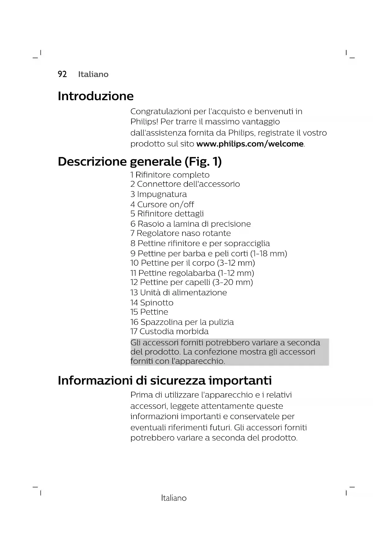 FrançaisItaliano Introduzione Congratulazioni per l'acquisto e benvenuti in Philips! Per trarre il massimo vantaggio dall'assistenza fornita da Philips, registrate il vostro prodotto sul sito www.philips.com/welcome. Descrizione generale (Fig. 1) 1 Rifinitore completo 2 Connettore dell'accessorio 3 Impugnatura 4 Cursore on/off 5 Rifinitore dettagli 6 Rasoio a lamina di precisione 7 Regolatore naso rotante 8 Pettine rifinitore e per sopracciglia 9 Pettine per barba e peli corti (1-18 mm) 10 Pettine per il corpo (3-12 mm) 11 Pettine regolabarba (1-12 mm) 12 Pettine per capelli (3-20 mm) 13 Unità di alimentazione 14 Spinotto 15 Pettine 16 Spazzolina per la pulizia 17 Custodia morbida Gli accessori forniti potrebbero variare a seconda del prodotto. La confezione mostra gli accessori forniti con l'apparecchio. Informazioni di sicurezza importanti Prima di utilizzare l'apparecchio e i relativi accessori, leggete attentamente queste informazioni importanti e conservatele per eventuali riferimenti futuri. Gli accessori forniti potrebbero variare a seconda del prodotto.