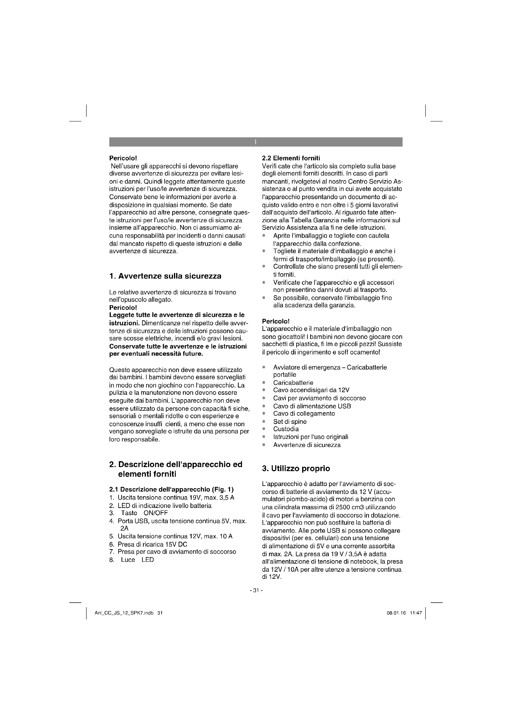 L‘apparecchio è adatto per l‘avviamento di soc- corso di batterie di avviamento da 12 V (accu- mulatori piombo-acido) di motori a benzina con una cilindrata massima di 2500 cm3 utilizzando il cavo per l‘avviamento di soccorso in dotazione. L‘apparecchio non può sostituire la batteria di avviamento. Alle porte USB si possono collegare dispositivi (per es. cellulari) con una tensione di alimentazione di 5V e una corrente assorbita di max. 2A. La presa da 19 V / 3,5A è adatta all‘alimentazione di tensione di notebook, la presa da 12V / 10A per altre utenze a tensione continua di 12V. Anl_CC_JS_12_SPK7.indb 31Anl_CC_JS_12_SPK7.indb 31 08.01.16 11:4708.01.16 11:47I