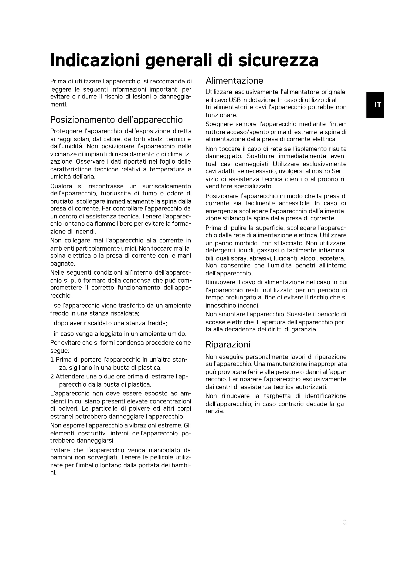 Utilizzato esclusivamente l'alimentatore originale e il cavo USB in dotazione. In caso di utilizzo di altrali alimentatori e cavi l'apparecchio potrebbe non funzionare.