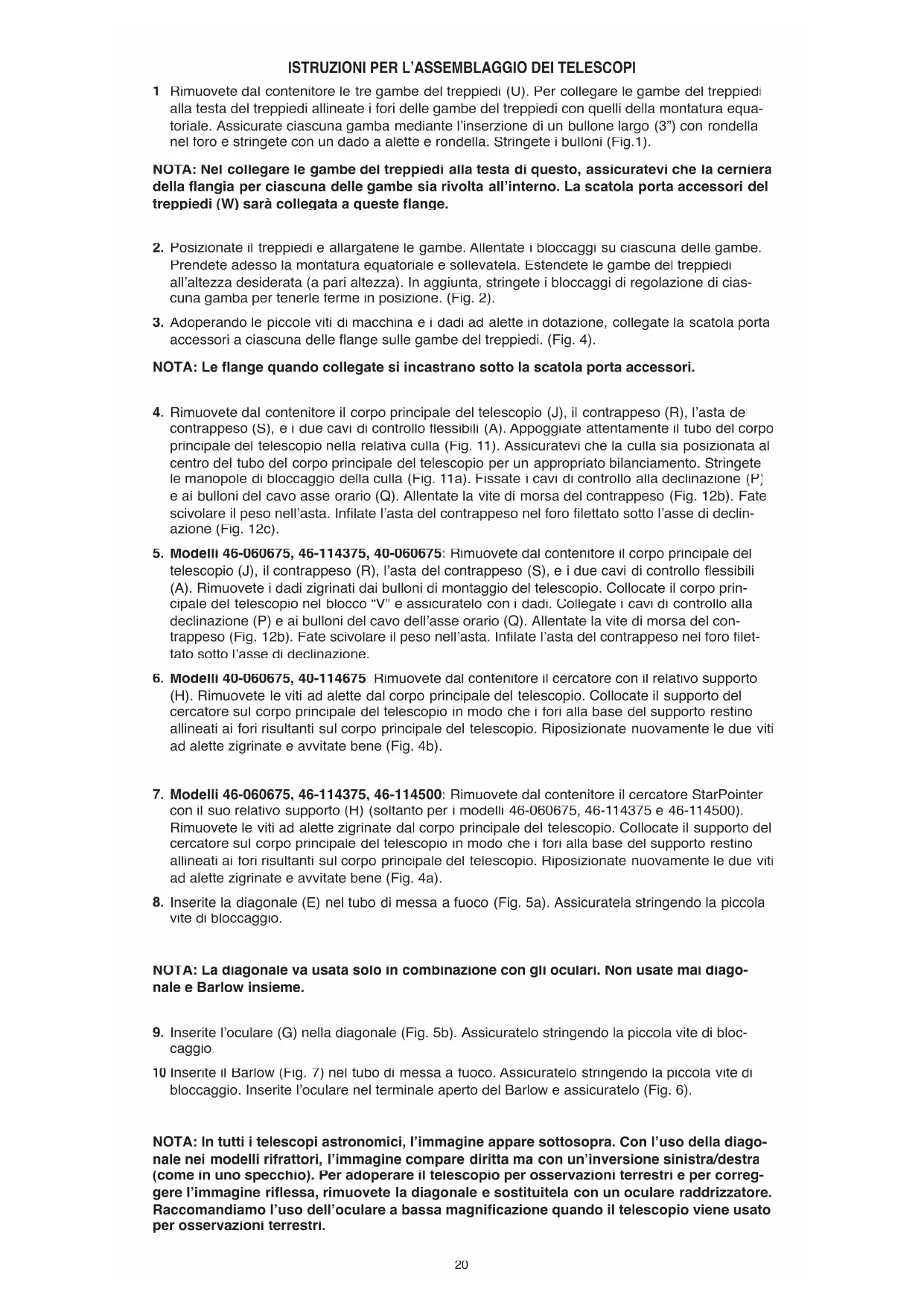 Inserite il Barlow (Fig. 7) nel tubo di messa a fuoco. Assicuratelo stringendo la piccola vite di bloccaggio. Inserite lʼoculare nel terminale aperto del Barlow e assicuratelo (Fig. 6). NOTA: In tutti i telescopi astronomici, lʼimmagine appare sottosopra. Con lʼuso della diago- nale nei modelli rifrattori, lʼimmagine compare diritta ma con unʼinversione sinistra/destra (come in uno specchio). Per adoperare il telescopio per osservazioni terrestri e per correg- gere lʼimmagine riflessa, rimuovete la diagonale e sostituitela con un oculare raddrizzatore. Raccomandiamo lʼuso dellʼoculare a bassa magnificazione quando il telescopio viene usato per osservazioni terrestri. 20Telescopi rifrattori possono essere usati per le osservazioni terrestri mediante lʼimpiego di un ocu- lare raddrizzatore. I telescopi riflettori vengono principalmente usati per fini astronomici. Il telescopio è adesso assemblato completamente ed è pronto per lʼuso. ATTENZIONE! Guardare il sole può causare danni gravi e permanenti alla vista. Non guar- date al sole con questo apparecchio e neppure ad occhio nudo.