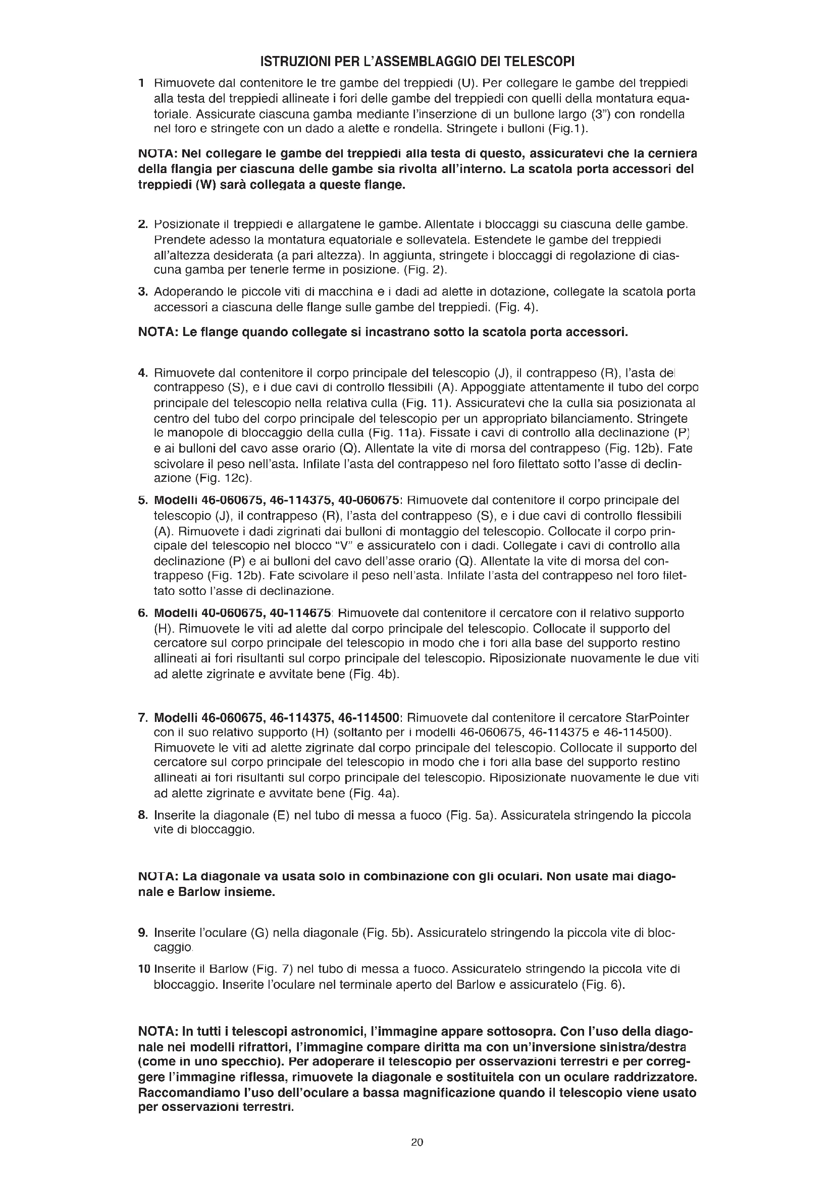 Modelli 46-060675, 46-114375, 40-060675: Rimuovete dal contenitore il corpo principale del telescopio (J), il contrappeso (R), lʼasta del contrappeso (S), e i due cavi di controllo flessibili (A). Rimuovete i dadi zigrinati dai bulloni di montaggio del telescopio. Collocate il corpo prin- cipale del telescopio nel blocco “V” e assicuratelo con i dadi. Collegate i cavi di controllo alla declinazione (P) e ai bulloni del cavo dellʼasse orario (Q). Allentate la vite di morsa del con- trappeso (Fig. 12b). Fate scivolare il peso nellʼasta. Infilate lʼasta del contrappeso nel foro filet- tato sotto lʼasse di declinazione.