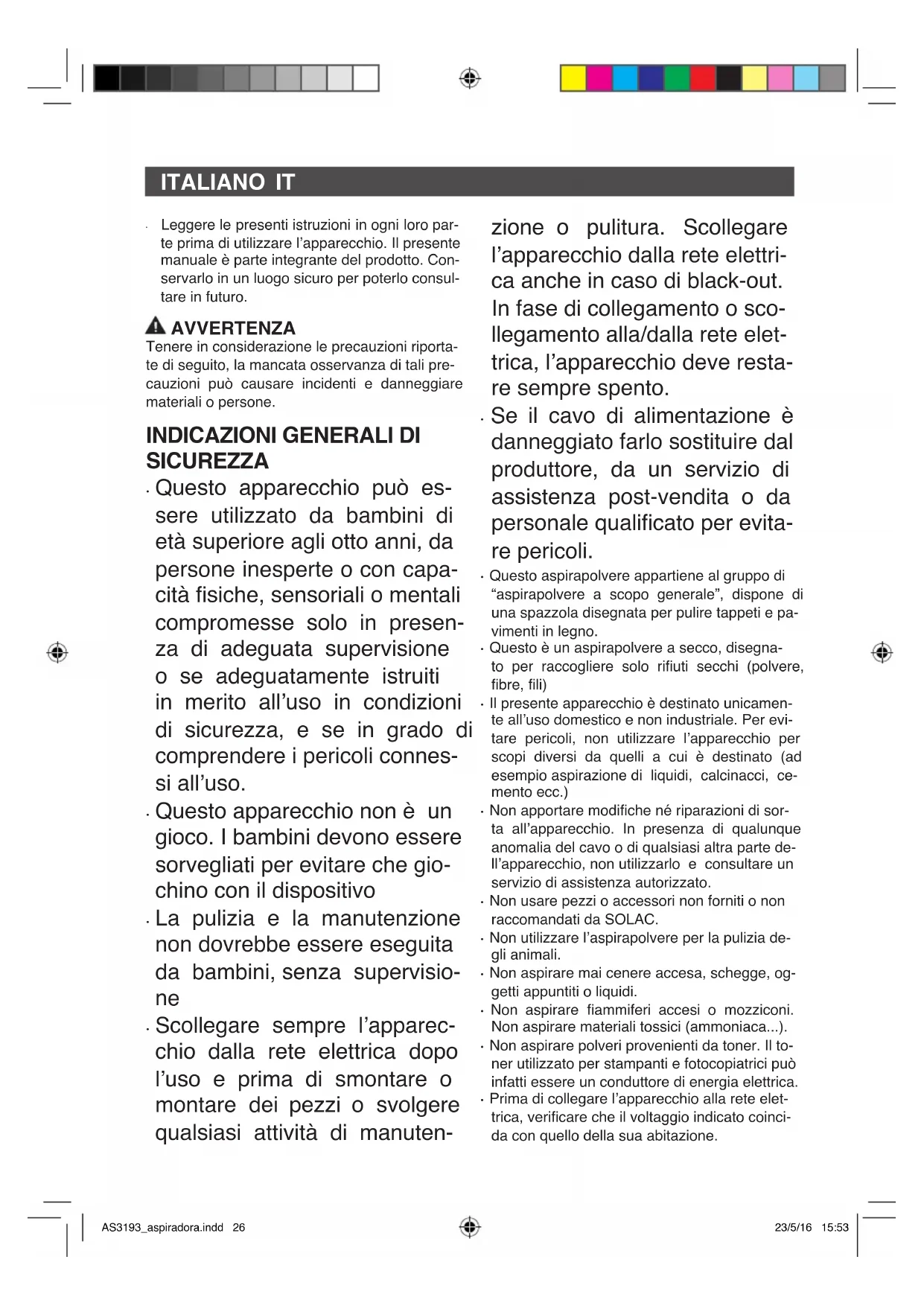 - Prima di collegare l’apparecchio alla rete elet- trica, vericare che il voltaggio indicato coinci- da con quello della sua abitazione. AS3193_aspiradora.indd 26 23/5/16 15:53it